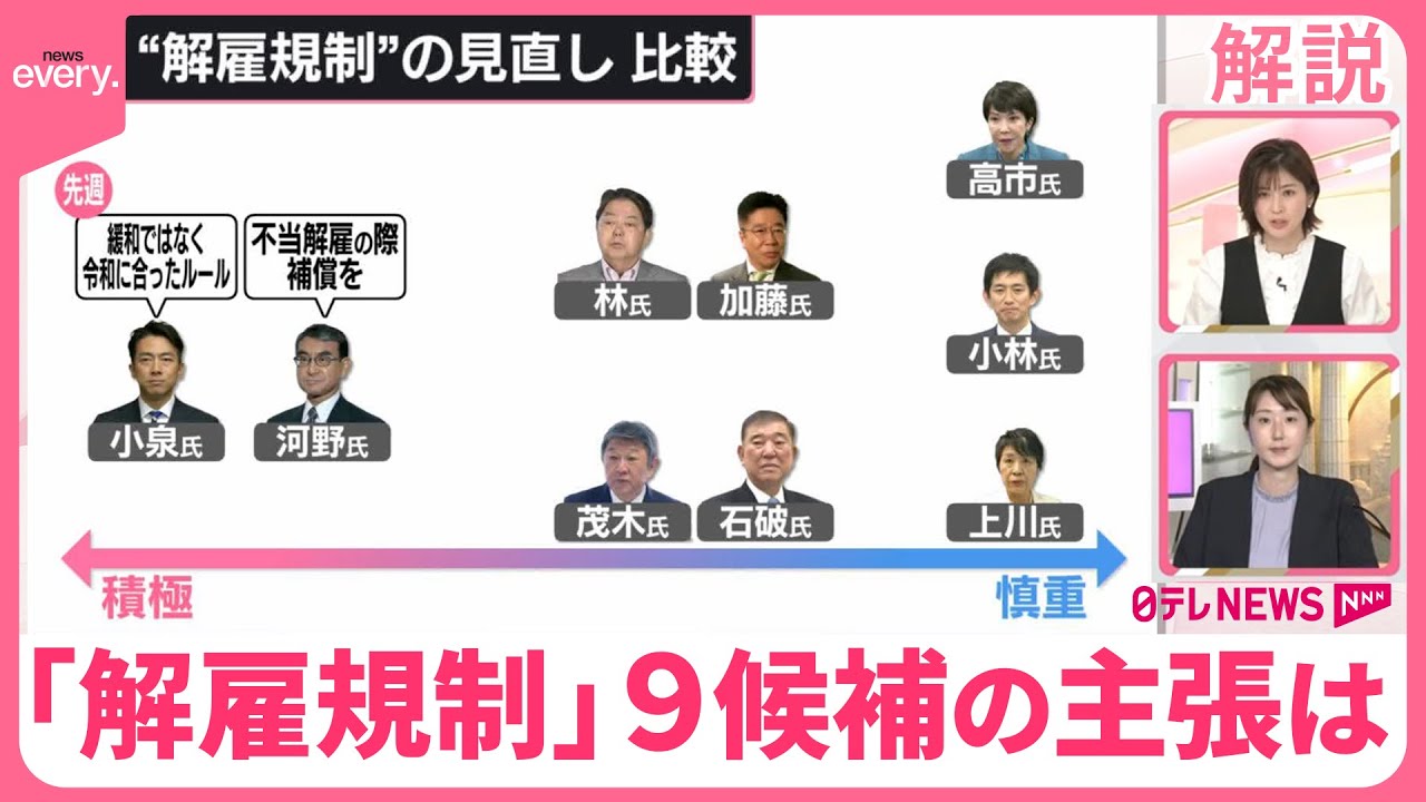 自民党の総裁選、投開票まであと9日。「news every.」では「ひと目で分かる政策比較」と題して、各候補の主張を整理してお伝えします。18日は、私たちの働き方にも大きく関わる「解雇規制」についてです。