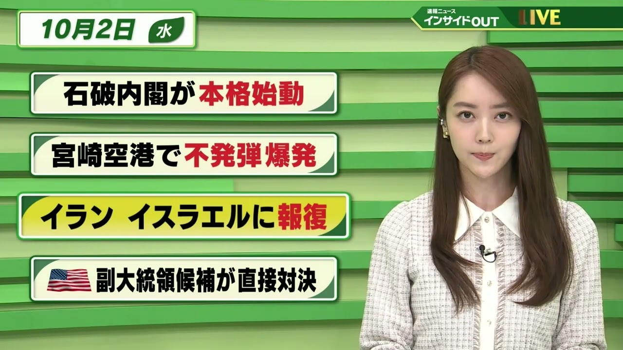 【今日のニュース 10月2日】「石破内閣が本格始動」「宮崎空港で不発弾 爆発」「イラン イスラエルに報復」「アメリカ 副大統領候補が直接対決」