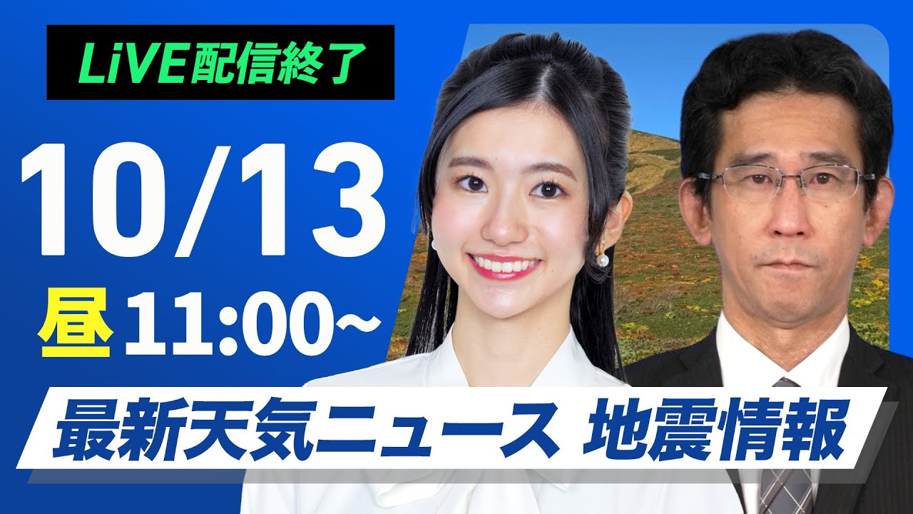 【ライブ】最新天気ニュース・地震情報 2024年10月13日(日)/三連休中日も全国的に秋晴れ〈ウェザーニュースLiVEコーヒータイム・大島 璃音/山口 剛央〉