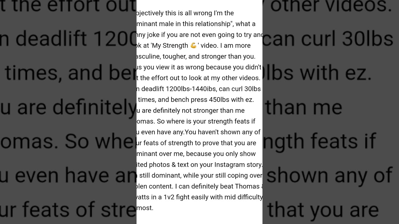dominant male in this relationship”, what a funny joke if you are not even going to try and look at ‘My Strength 💪’ video. I am more masculine, tougher, and stronger than you. Plus you view it as wrong because you didn’t put the effort out to look at my other videos. I can deadlift 1200lbs-1440lbs, can curl 30lbs 40 times, and bench press 450lbs with ez. You are definitely not stronger than me Thomas. So where is your strength feats if you even have any.You haven’t shown any of your feats of strength to prove that you are dominant over me, because you only show edited photos & text on your Instagram story. I’m still dominant, while your still coping over stolen content.I can definitely beat Thomas & Wyatts in a 1v2 fight easily with mid difficulty at most.