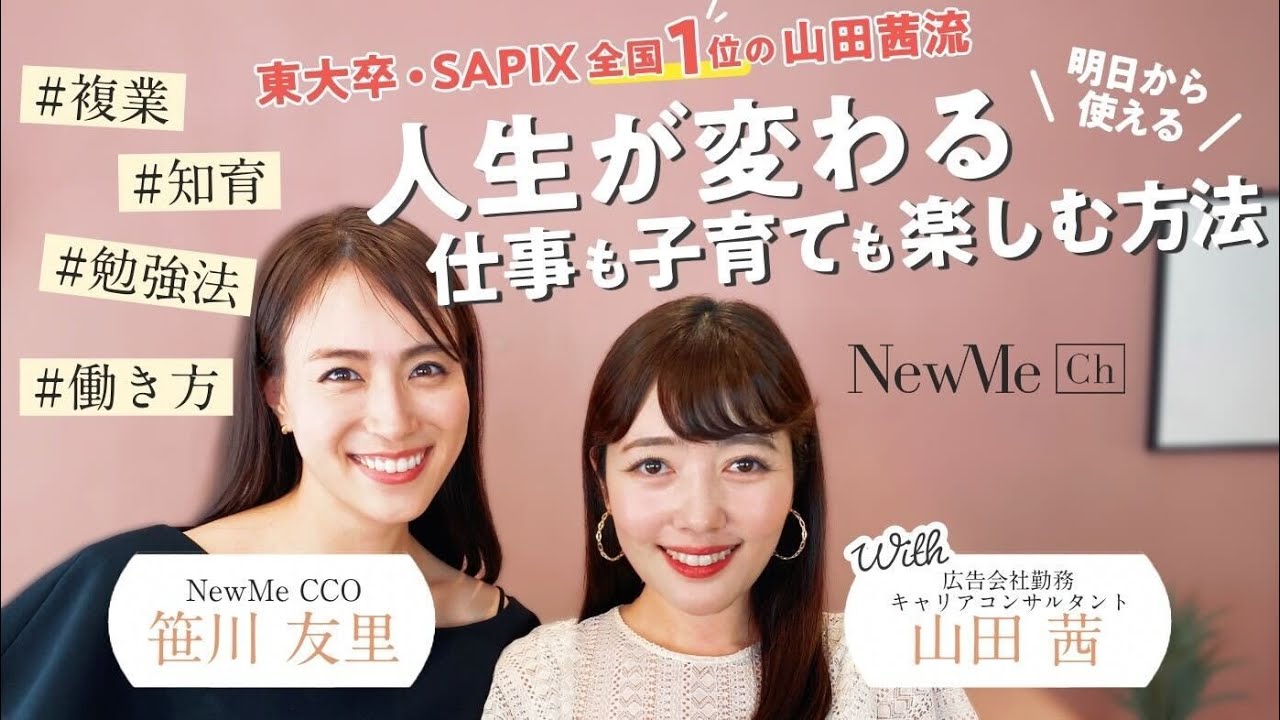 今回は、広告会社に13年間勤める中でコピーライター、営業、広報など様々な部署を経験し、その傍ら自身の経験やパーソナリティを生かし、『東大卒ママブロガー・インスタグラマー』としても活動している山田茜さんと対談しました。子育て・知育・リスキリング・新時代の働き方・落ち込んだ時の復活法、そして中学2、3年でSAPIX全国1位だったという山田さんに勉強法についても伺ってきました!————————————————————————————————————————