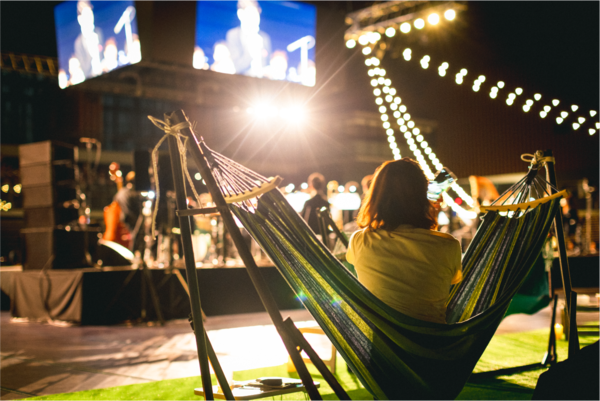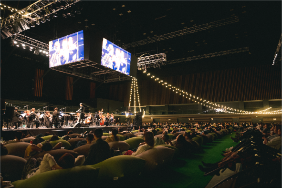 本イベントは、リクライニングチェアやハンモック、ビーズクッションなどのくつろげる座席で、トッププロオーケストラによるJPOPヒット曲の生演奏を味わうことができるコンサート。