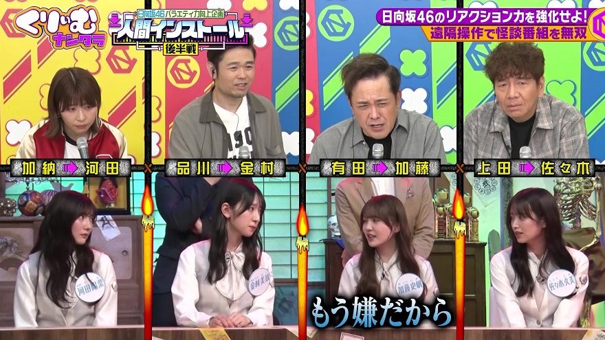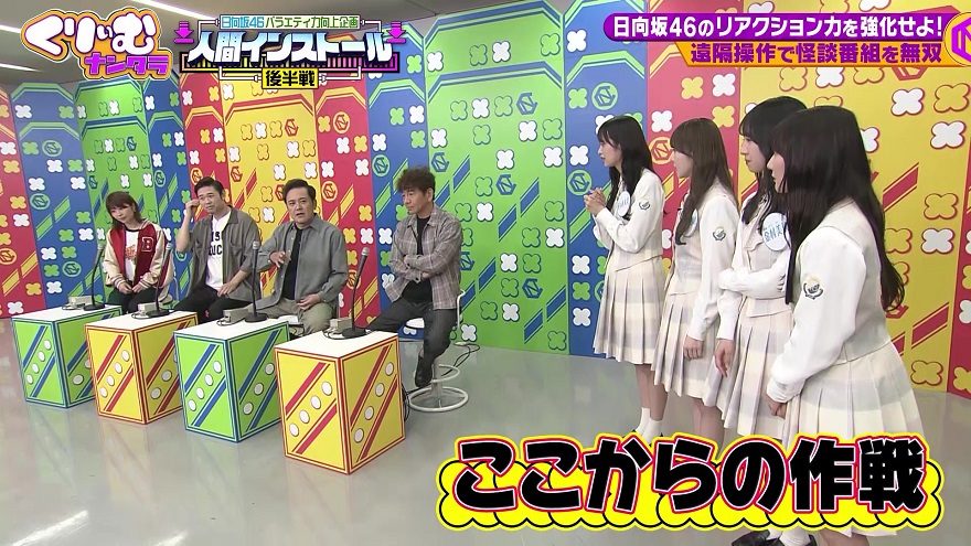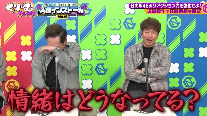 くりいむしちゅーたちが日向坂46のメンバー(佐々木久美、加藤史帆、金村美玖、河田陽菜)を遠隔操作し、“お笑い無双”に変身させるこの企画。