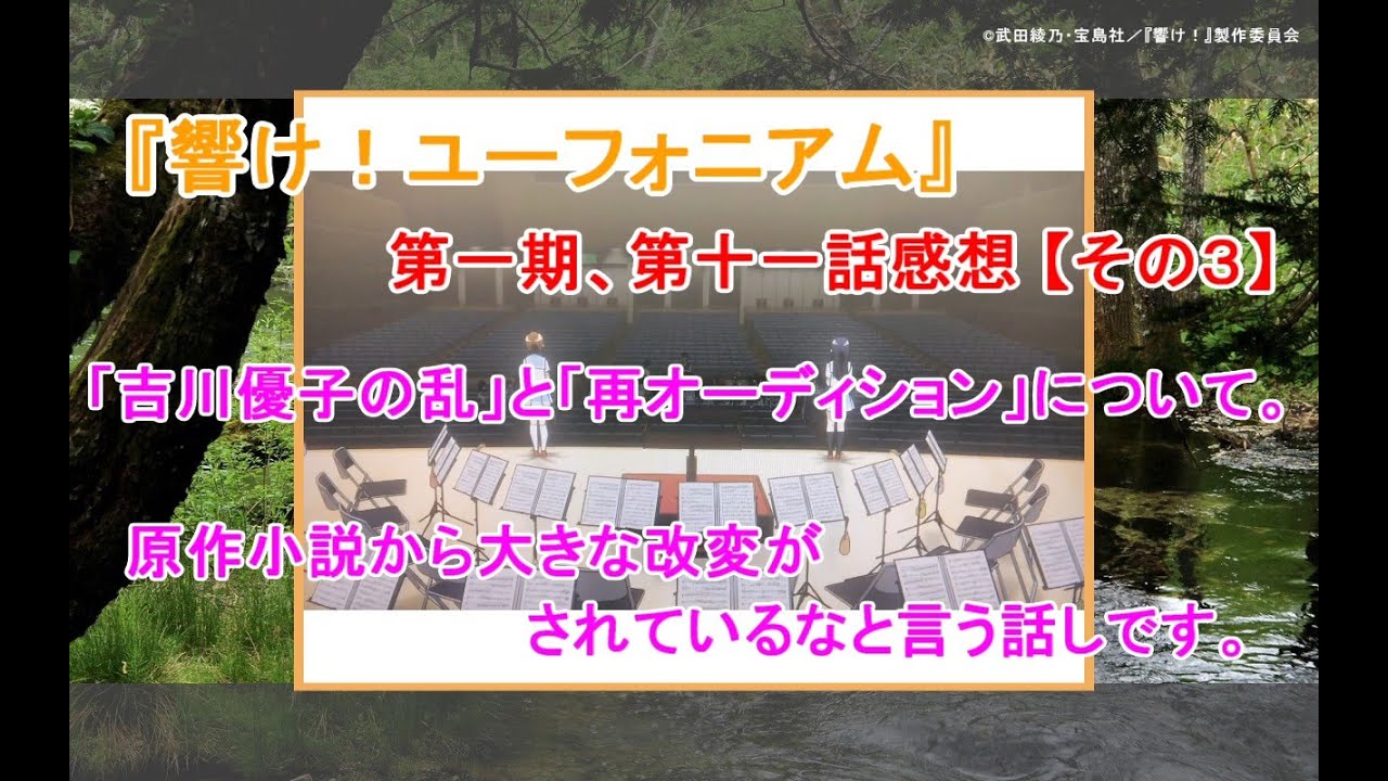 「吉川優子の乱」と「再オーディション」の関係についてあらためて考えました。~『響け!ユーフォニアム』第一期第十一話感想【その3】~ 『響け!ユーフォニアム』第一期第十一話の感想の【その3】です。 今回は、吉川優子が滝先生による新体制に謀反を起こした「吉川優子の乱」と、香織と麗奈によって行われたトランペット・ソロの「再オーディション」の関係についてあらためて考えたところ、これは第三期に遜色ないほどの原作改変ではないかと気付いたので、そのお話しをします。 announcerアナアナ美人女子アナ女子アナ美人滝香織 Write A Commentコメントを投稿するにはログインしてください。