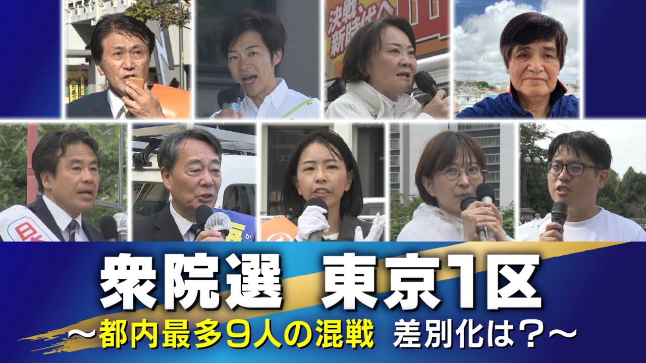 10月27日に投開票を迎える衆議院選挙について、TOKYO MXは東京都内の注目選挙区の選挙戦を連日お伝えしてきました。今回は千代田区と新宿区にまたがる「東京1区」です。前職2人・新人7人という都内の選挙区で最も多い9人が立候補していて、混戦の様相を見せています。東京1区には届け出順に諸派の新人・新藤伸夫さん(75)、日本維新の会の新人・音喜多駿さん(41)、自民党の前職・山田美樹さん(50)、無所属の新人・新垣宏さん(80)、共産党の新人・中野顕さん(60)、立憲民主党の前職・海江田万里さん(75)、参政党の新人・櫻井祥子さん(40)、無所属の新人・佐藤沙織里さん(35)、みんなでつくる党の新人・高木寛史さん(40)の9人が立候補しています。