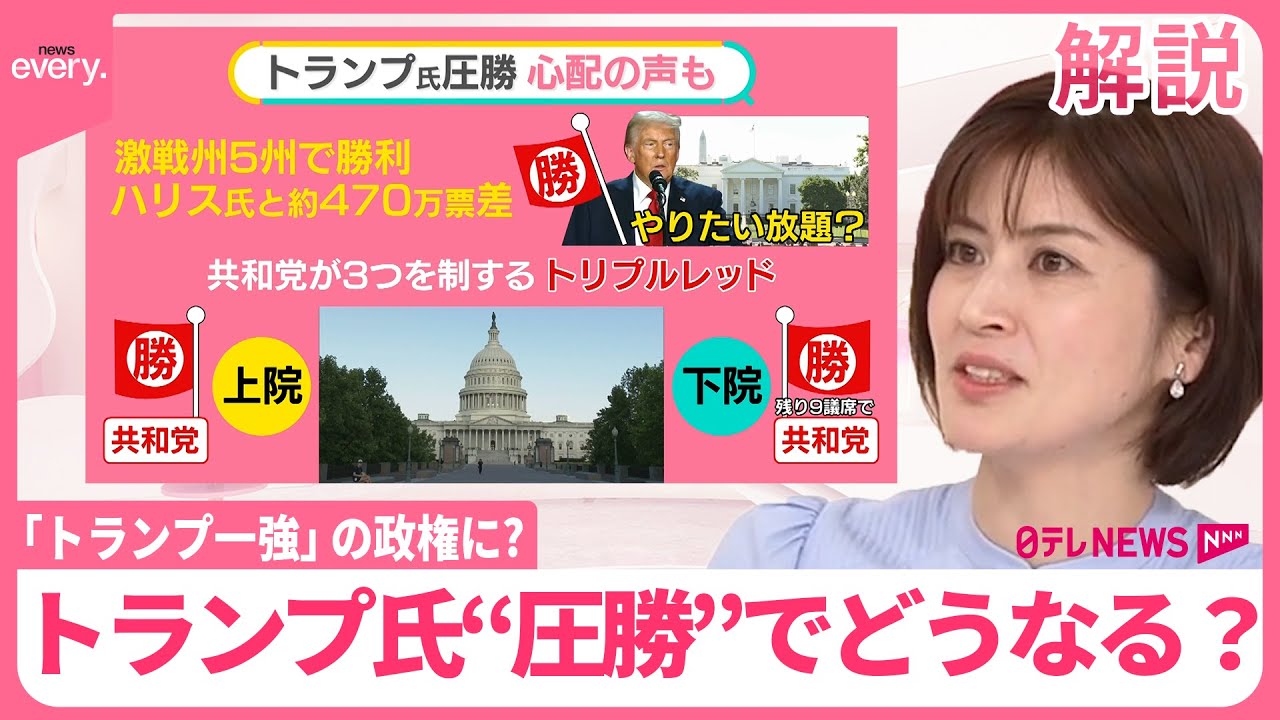 「大統領がいるホワイトハウスと議会の上院と下院、この3つをすべて共和党がおさえることを、共和党のシンボルカラーの赤にちなんで『トリプルレッド』といいます。こうなると議会の抵抗もないので、トランプ次期大統領のやりたい放題になるのではないかという懸念の声も上がっています」