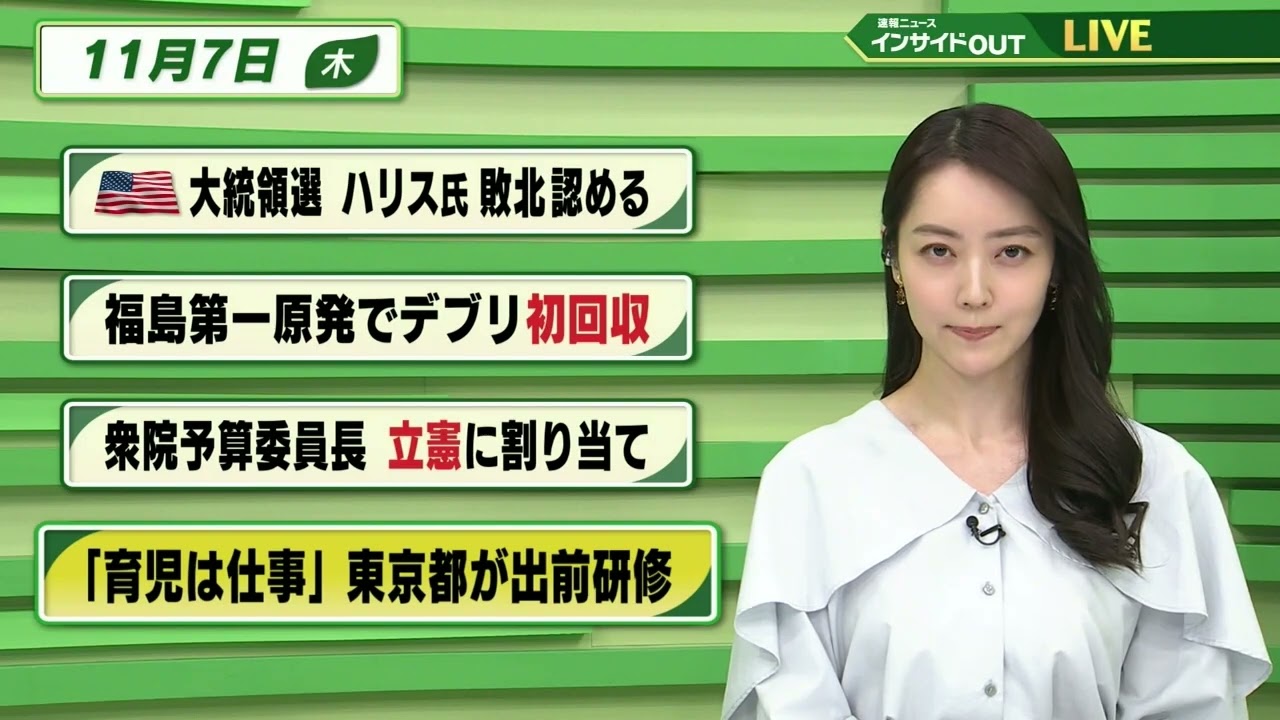 【今日のニュース 11月7日】「アメリカ大統領選 ハリス氏敗北認める」「福島第一原発でデブリ 初回収」「衆院予算委員長 立憲に割り当て」「”育児は仕事”東京都が出前研修」BS11