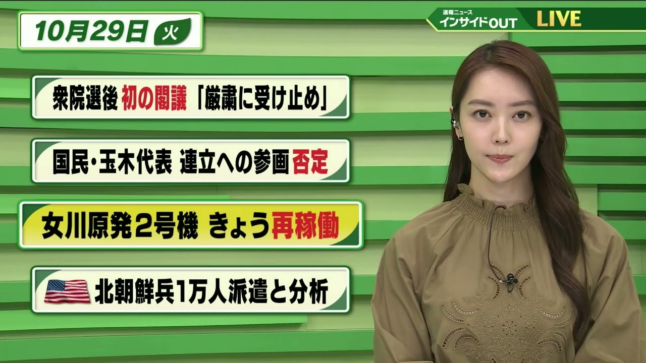 【今日のニュース 10月29日】「衆院選後初の閣議 ”厳粛に受け止め”」「国民・玉木代表 連立への参画否定」「女川原発2号機 きょう再稼働」「米国防総省 北朝鮮兵1万人派遣と分析」BS11