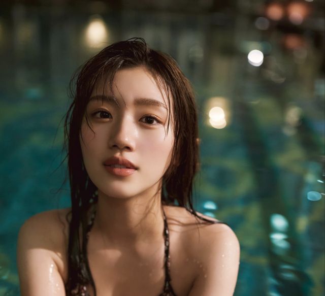今回公開されたのは、小花柄の水着に身を包み、夜のプールで泳ぐカット。いつも笑顔で元気な印象の佐々木とギャップのあるアンニュイな表情に、思わずドキっとしてしまう一枚となっている。