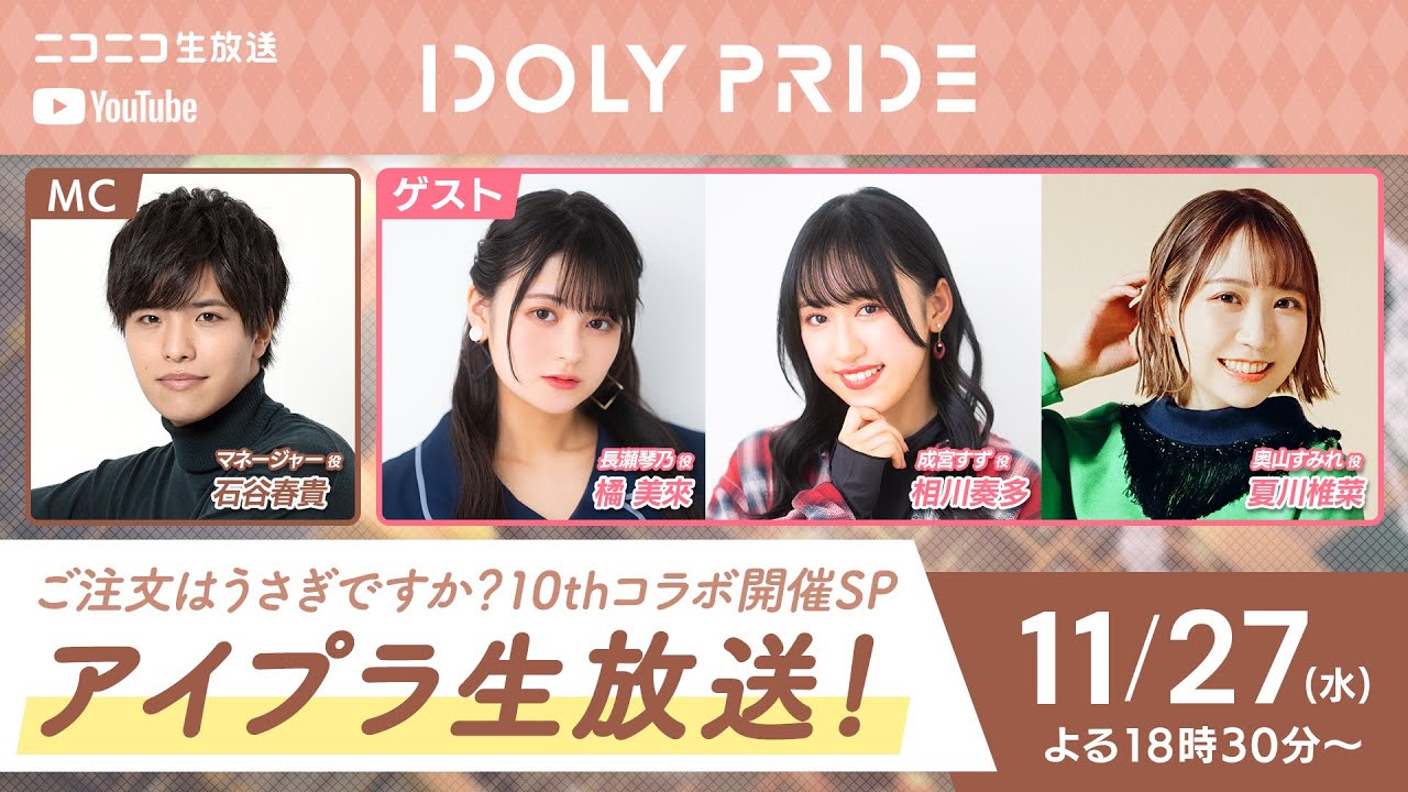 【11/27 18:30〜】アイプラ生放送~ご注文はうさぎですか?10thコラボ開催SP~■出演:マネージャー役/石谷春貴、長瀬琴乃役/橘美來、成宮すず役/相川奏多、奥山すみれ役/夏川椎菜【アイプラ】