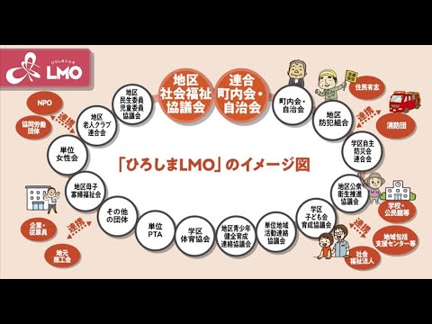 広島市では、「自分たちのまちは、自分たちで創り、守る」という基本的な考え方の下、概ね小学校区を活動範囲として、地域に関わる多様な主体が連携しながら様々な地域課題の解決に取り組む広島型地域運営組織「ひろしまLMO」の設立・運営を推進し、市民主体のまちづくりを進めています。