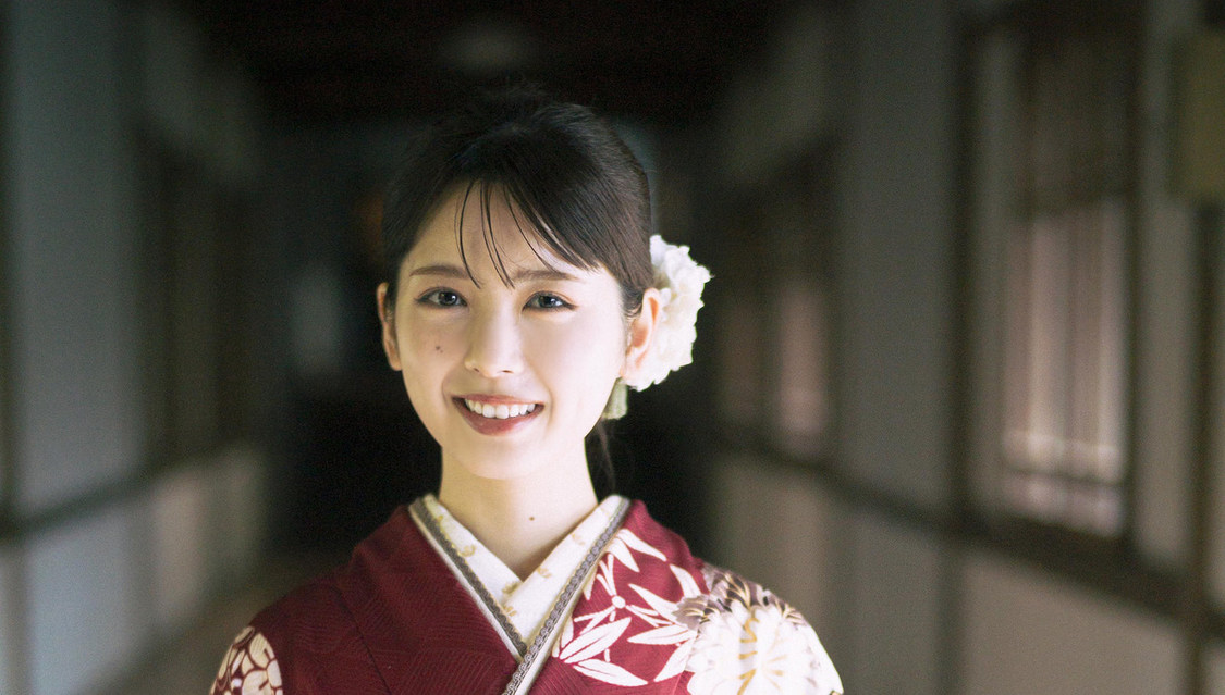 そんな筒井を、今回は美しい紅葉に囲まれ、天狗の力が棲むとされる関東屈指のパワースポットでもあるお寺にて撮影。どこか幼い雰囲気も残しつつも、赤い振袖姿では20歳を迎えた彼女の現在の美しさをストレートに収めた。