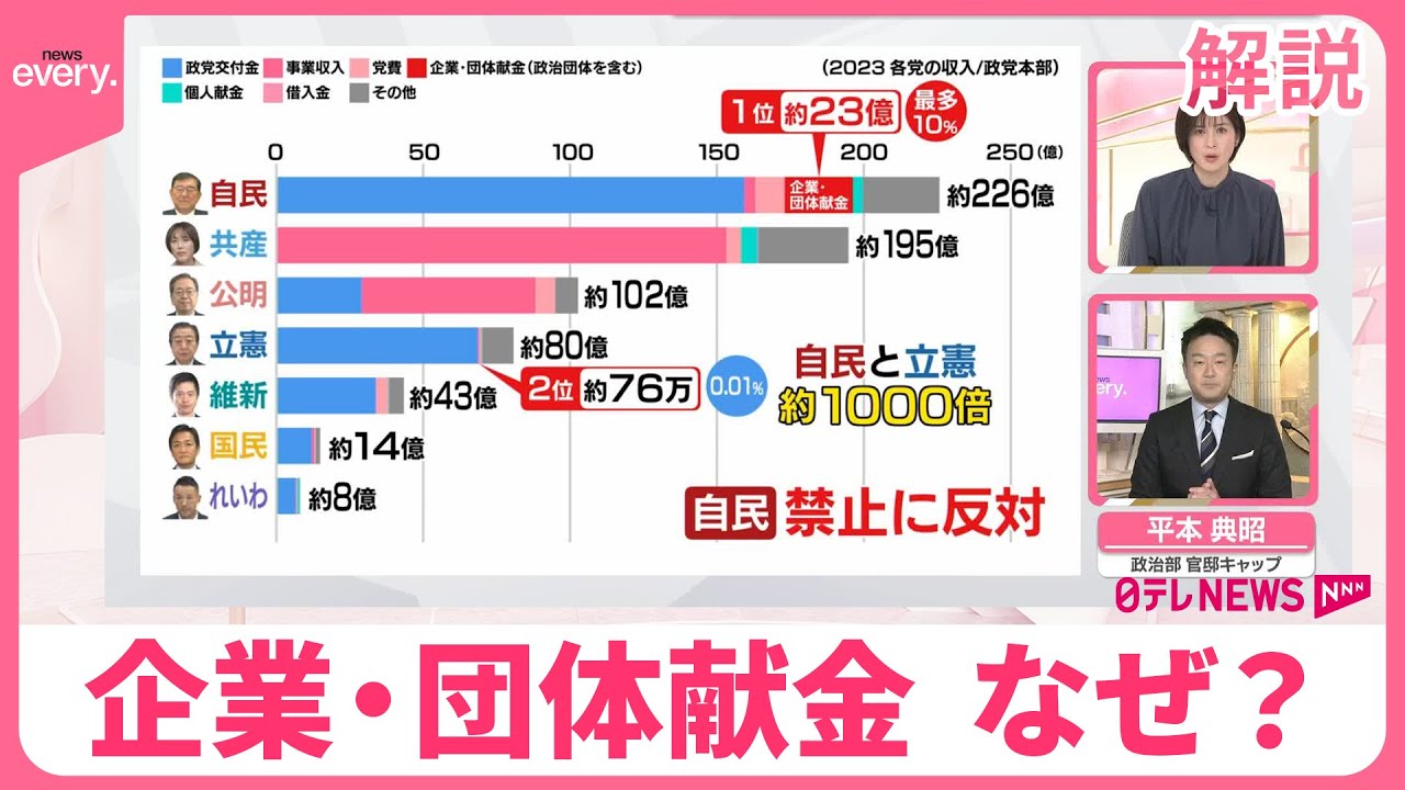 「なぜ、野党は『企業・団体献金』の禁止を強く主張し、一方で自民党は反対しているのか。日本テレビ政治部官邸キャップの平本典昭記者が解説します」