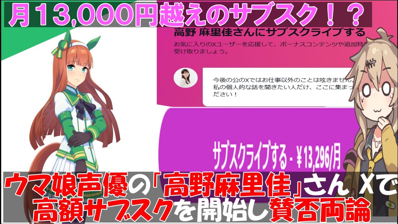 ウマ娘声優で有名な「高野麻里佳」さん Xで高額サブスクを開始し賛否両論になってしまう チャンネル登録していただけると大変励みになります 《使用音声》 VOICEVOX:四国めたん VOICEVOX:春日部つむぎ 《使用BGM》 shuffle shuffle (KK) 《使用効果音》 効果音ラボ female voice actorsvoice actorsvoice actressesアニメウマ娘こうのまりかニュース声優美人声優高野麻里佳 Write A Commentコメントを投稿するにはログインしてください。