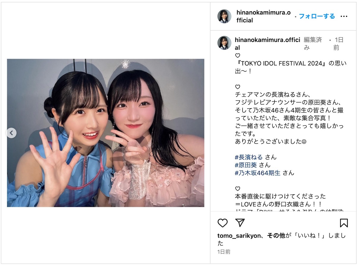 上村ひなの(日向坂46)と野口衣織(=LOVE)が、8月4日に開催された『TOKYO IDOL FESTIVAL 2024』で再会を果たし、お互いのSNSにてツーショットを公開している。
