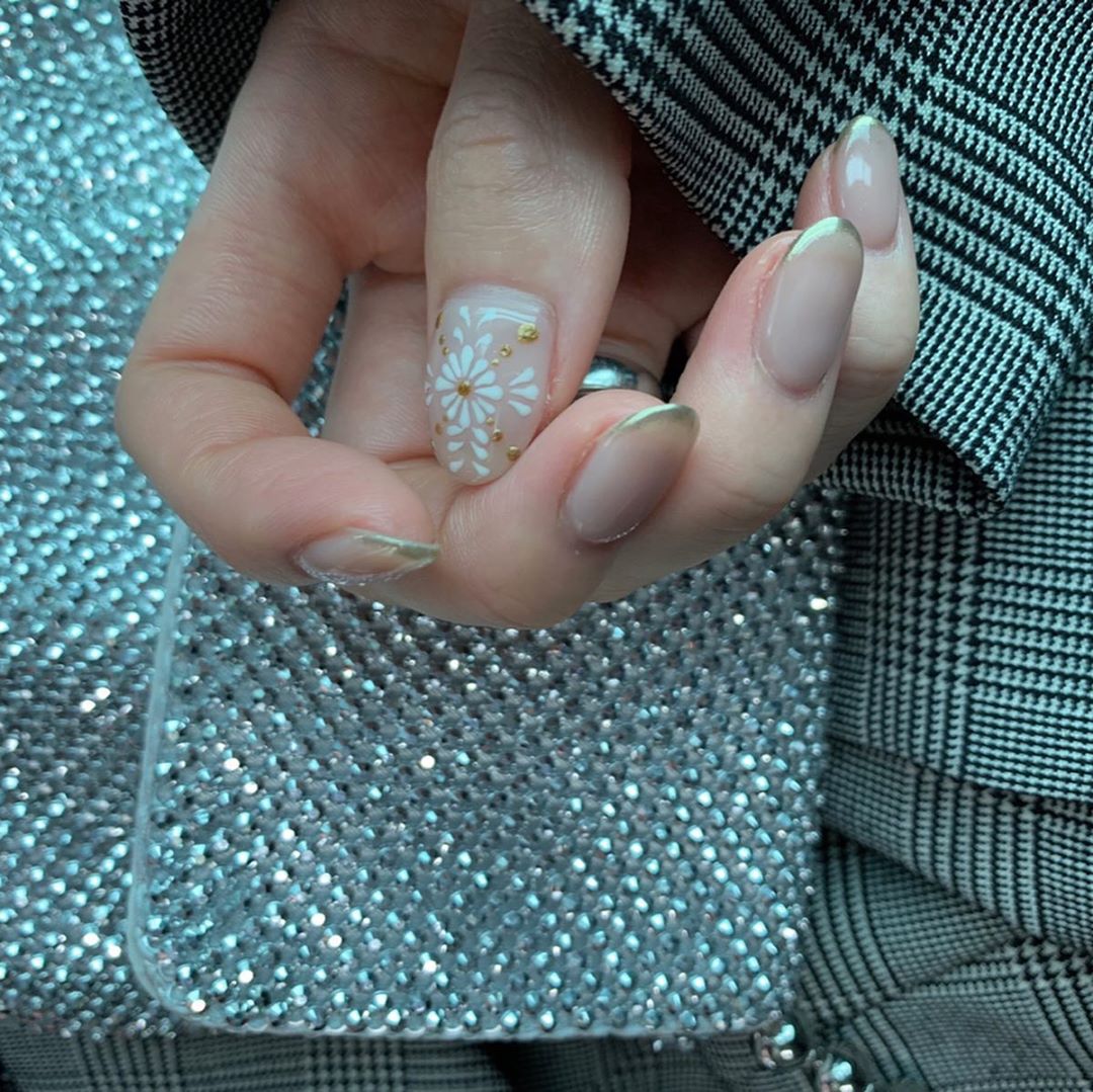 new nails💎 ヌーディーカラーに ゴールドミラーのフレンチネイルと お花の刺繍ネイル。 可愛い〜〜 #ヨコタノネイル #hikaru_yokota#横田ひかるHikaru YokotaYokota Hikaruヨコタノネイル
