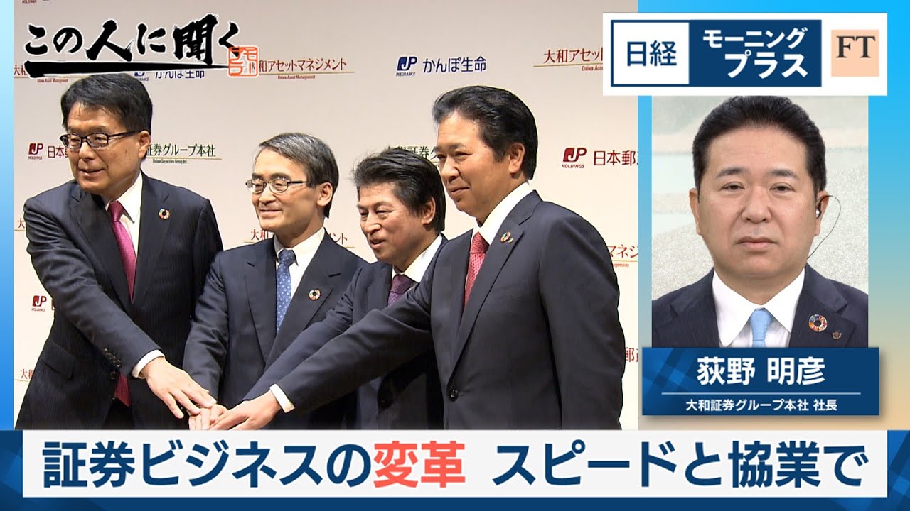 「この人に聞く」。大和証券グループ本社の荻野明彦社長。4月に社長に就任して以来、証券ビジネスの変革を急ピッチで進めています。あおぞら銀行やかんぽ生命などと相次いで資本業務提携をまとめるなど協業でスピード感を見せました。「貯蓄から投資」を定着させるための戦略を聞きます。