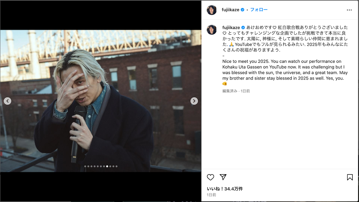 2025年初めての投稿に藤井は「あけおめです」「紅白歌合戦ありがとうございました」と挨拶しながら、「とってもチャレンジングな企画でしたが挑戦できて本当に良かったです. 太陽に, 神様に, そして素晴らしい仲間に恵まれました」とパフォーマンスを振り返っている。映像は一発撮りで、藤井が屋上に登ると遠くに見えるビルディングに朝日が降り注ぐ神がかった演出となっていた。藤井は「YouTubeでもフルが見られるみたい. 2025年もみんなにたくさんの祝福がありますよう」と記し、ポスターが貼られたシャッターの前でのショットやラストに藤井に花を手向けた少年とのツーショット、スタッフ陣との記念写真などをアップしている。