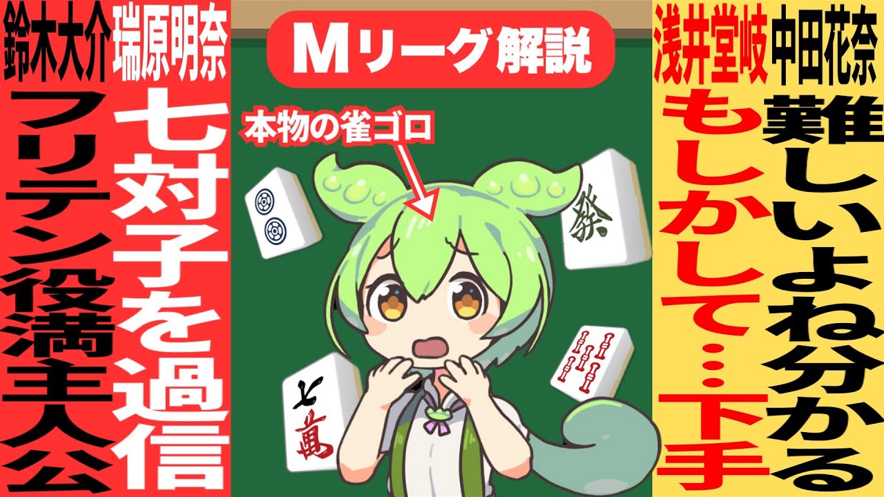 大介プロが誤ロンしながら役満和了って111.3ポイント!!主人公すぎるのだ【Mリーグ甘口解説|1月13日】 https://m-league.jp/ #鈴木大介 #中田花奈 #瑞原明奈 #醍醐大 #岡田紗佳 #mリーグ #雀ゴロずんだもん #麻雀 #麻雀プロ VOICEVOX:ずんだもん https://voicevox.hiroshiba.jp/ mリーグnogizakanogizaka46中田花奈乃木坂乃木坂46雀ゴロずんだもん麻雀 Write A Commentコメントを投稿するにはログインしてください。