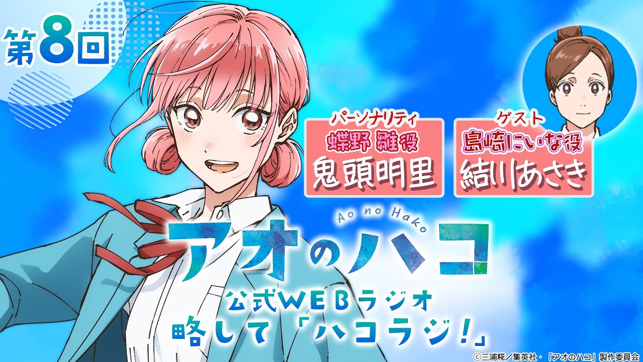 隔週で2人が交代制でパーソナリティを務め、毎回ゲストをお迎えしてTVアニメ『アオのハコ』をどこまでもアオく盛り上げます! 第8回のゲストは、島崎にいな役の結川あさきさん!