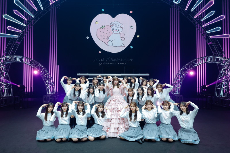 ここからは、期別の楽曲に東村が参加するスペシャルパフォーマンス。まずは、東村を慕う四期生の藤嶌果歩がセンターを務める「見たことない魔物」。そして「めいちごさんをジャムにしよー!」という掛け声から、三期生曲「この夏をジャムにしよう」。続く二期生曲「世界にはThank you!が溢れている」では、最後に東村を囲んで大きなハートを作った。そして一期生と「夏色のミュール」を歌唱。この楽曲は、東村の発案で発表当時の衣装を着て踊った。
