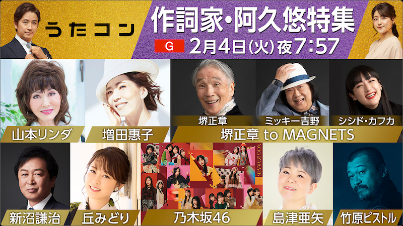 2月4日のNHK〈うたコン〉は「作詞家・阿久悠特集」と題し生放送される。