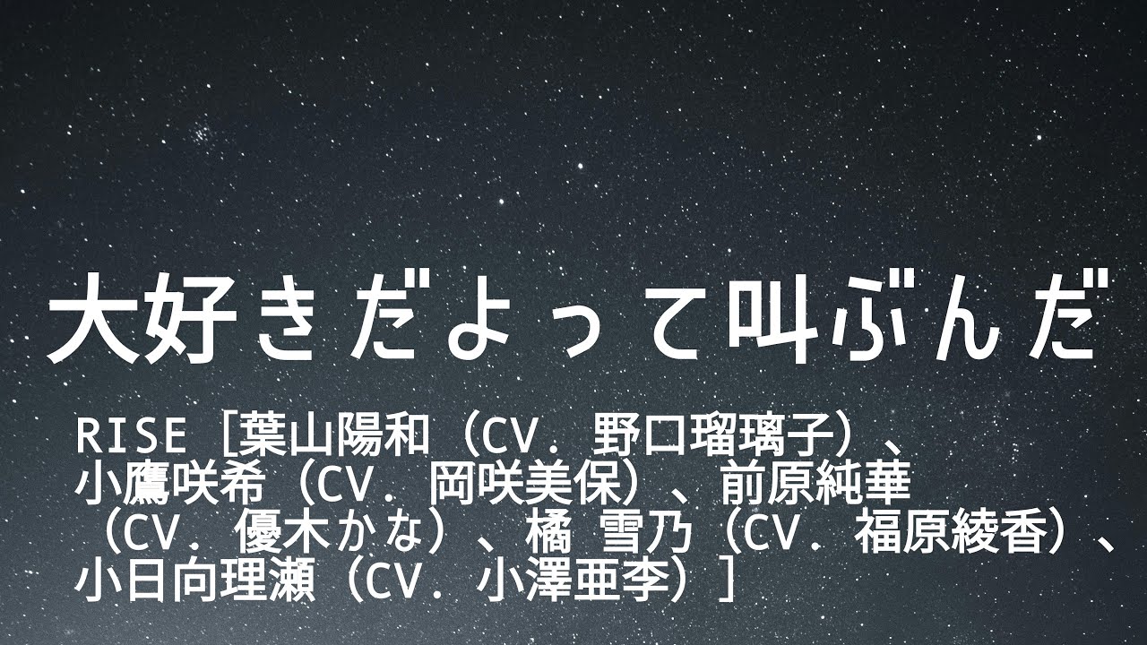 KARAOKE 大好きだよって叫ぶんだRISE[葉山陽和(CV.野口璃子)小鷹咲希(CV岡咲美保)、前原純華(CV.優木かな)、橘 雪乃(CV.福原綾香)、小日向理瀬(CV.小澤中季)] female voice actorsvoice actorsvoice actresses声優福原綾香 美人声優 Write A Commentコメントを投稿するにはログインしてください。