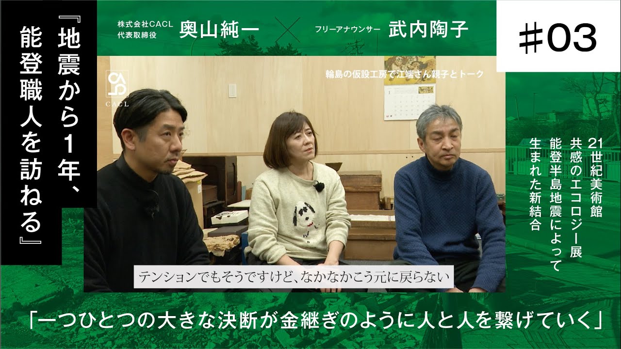 【奥山純一×武内陶子】# 3本編 /輪島の仮設工房へ / 一つひとつの大きな決断が金継ぎのように人と人とを繋げていく / 地震から一年、能登人を訪ねる 地震から1年、奥山純一と武内陶子さんが能登職人を訪ねます。 「かけら」に目を向け、継いでいく。奥山純一が考える、社会を変える方法論 announcerアナアナ美人女子アナ女子アナ美人武内陶子 Write A Commentコメントを投稿するにはログインしてください。