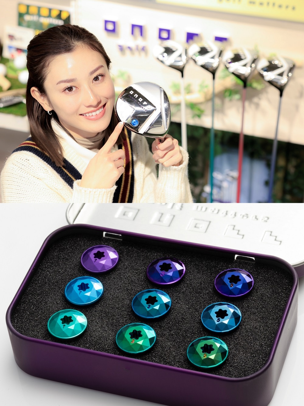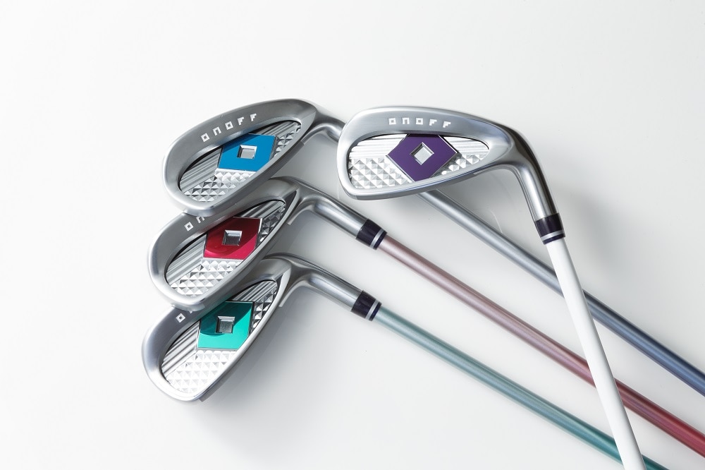 新しい「オノフレディ」は、前モデル同様「カラーカスタム」が大きなセールスポイント。パープルをメインカラーとしながらも、今回はシャフト5色、グリップ4色のなかから自由に選んで組み合わせられるだけでなく、アイアンのバックフェースのバッジが4色、さらにドライバーヘッドに装着されるウェイトビス「ジュエルウェイトスクリュー」も3色から選べるようになっている。