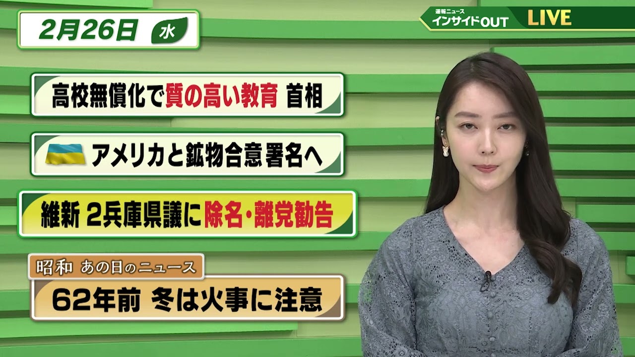 【今日のニュース 2月26日】「高校無償化で質の高い教育 首相」「ウクライナ アメリカと鉱物合意 署名へ」「維新 2兵庫県議に除名・離党勧告」「昭和あの日のニュース62年前・冬は火事に注意」BS11