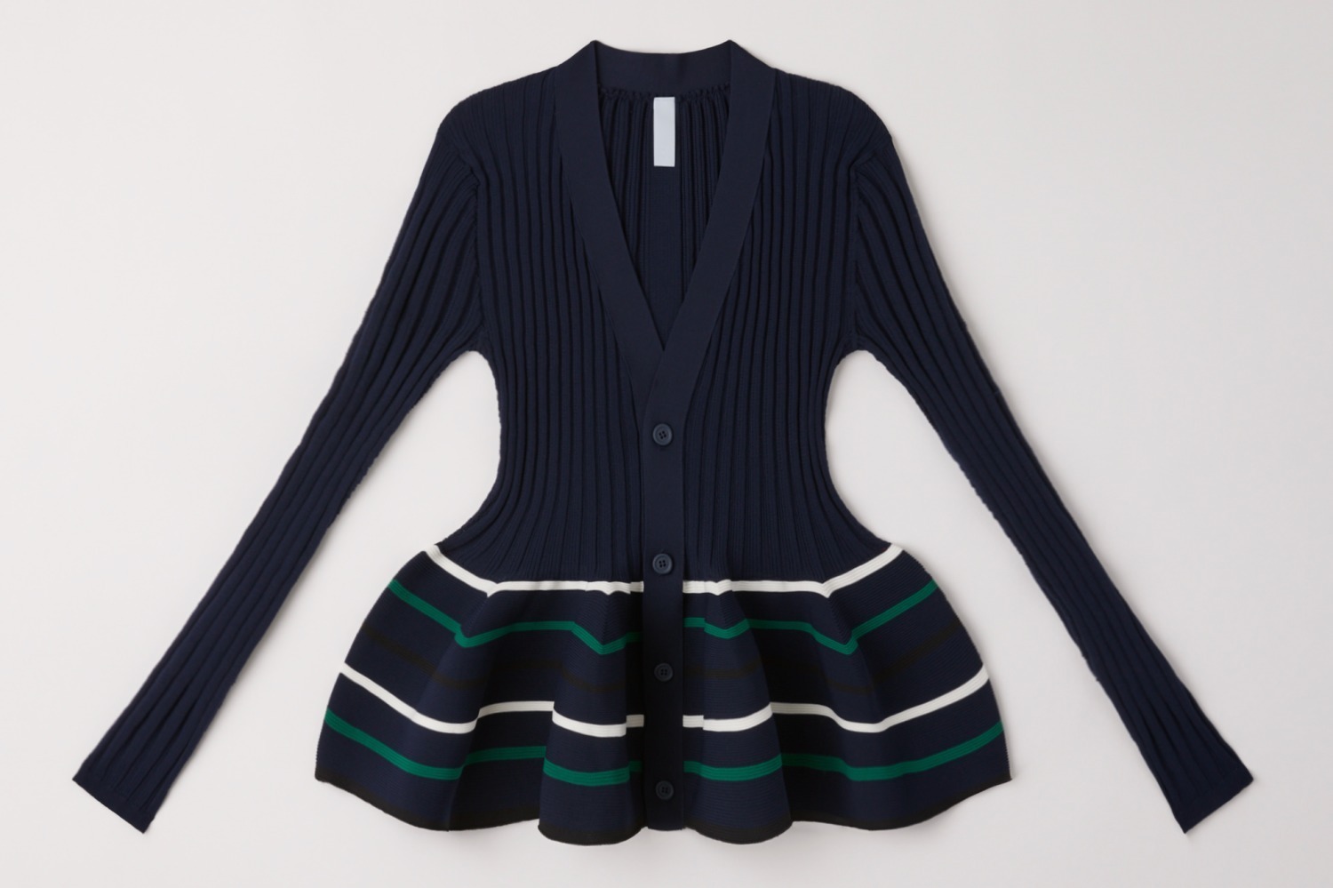 CFCL 大阪のオープンを記念して、ブランドを象徴する「ポッテリー(POTTERY)」シリーズの限定ニットウェアを展開。コンピュータープログラミングを駆使することで、立体的な壺型フォルムに仕上げたホールガーメントニットを、ネイビーにホワイトとグリーンのボーダーを施したカラーで用意する。