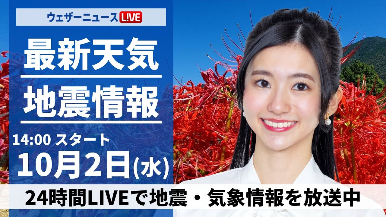 【ライブ】最新天気ニュース・地震情報2024年10月2日(水)/前線が南下し広範囲で雨に〈ウェザーニュースLiVEアフタヌーン・大島 璃音/芳野 達郎/福吉 貴文〉
