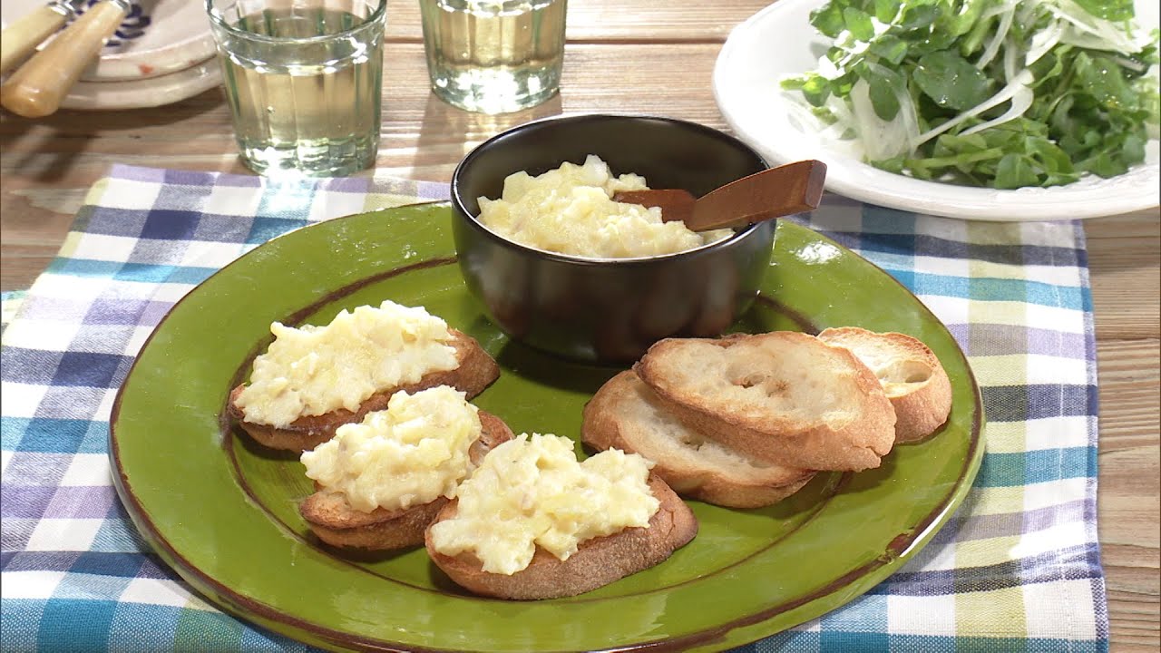 甘塩だらのバッカラマンテカート 材料(2人分):甘塩だら(2切れ)、じゃが芋(1個)、玉ねぎ(1/4個)、にんにく(1かけ)、白ワイン(1/4カップ)、牛乳(1カップ)、パルメザンチーズ(おろす 大さじ1)、塩、バゲット(1cm厚さ 6枚)、オリーブ油