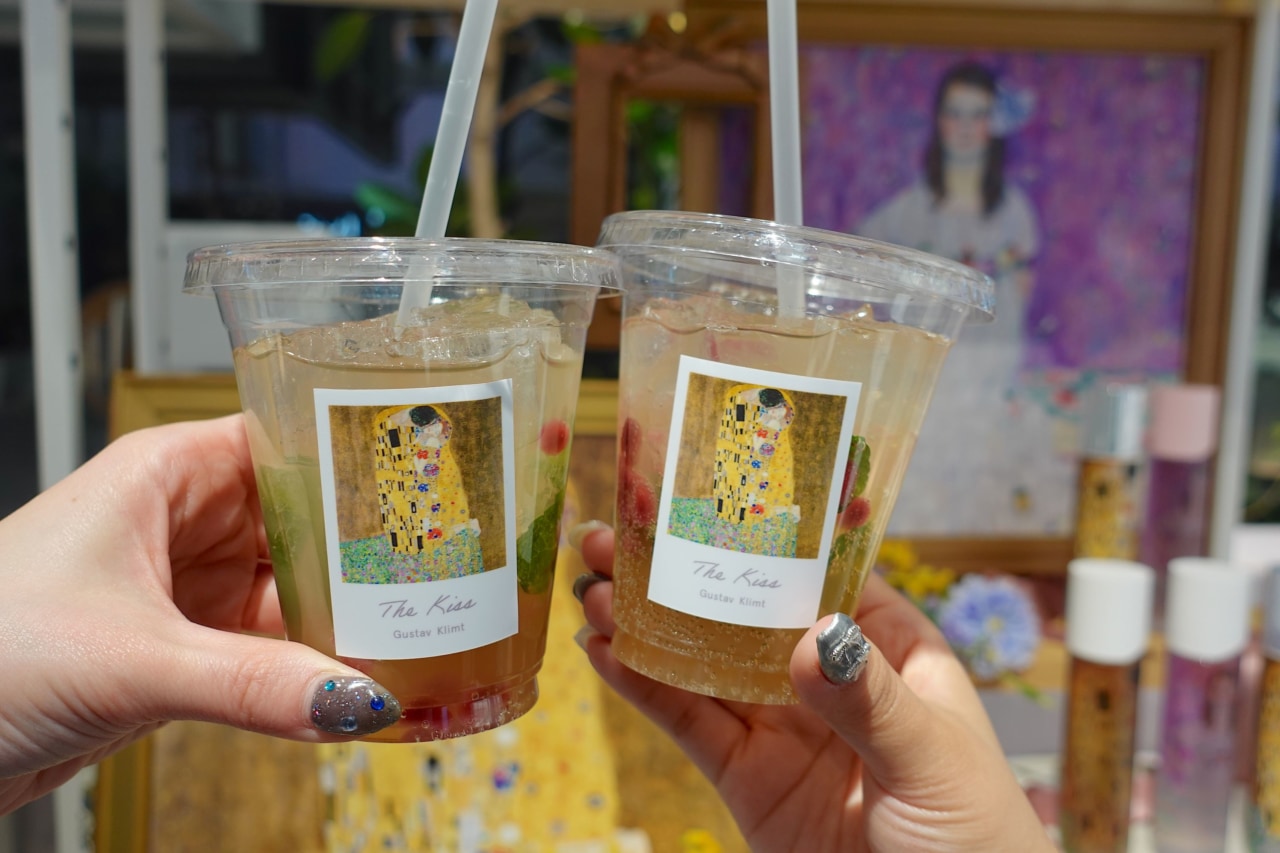 毎月変わる名画に合わせてドリンクも変わっていきます。写真は第一弾であるグスタフ・クリムトの名画「接吻」にインスピレーションを受けたドリンク。