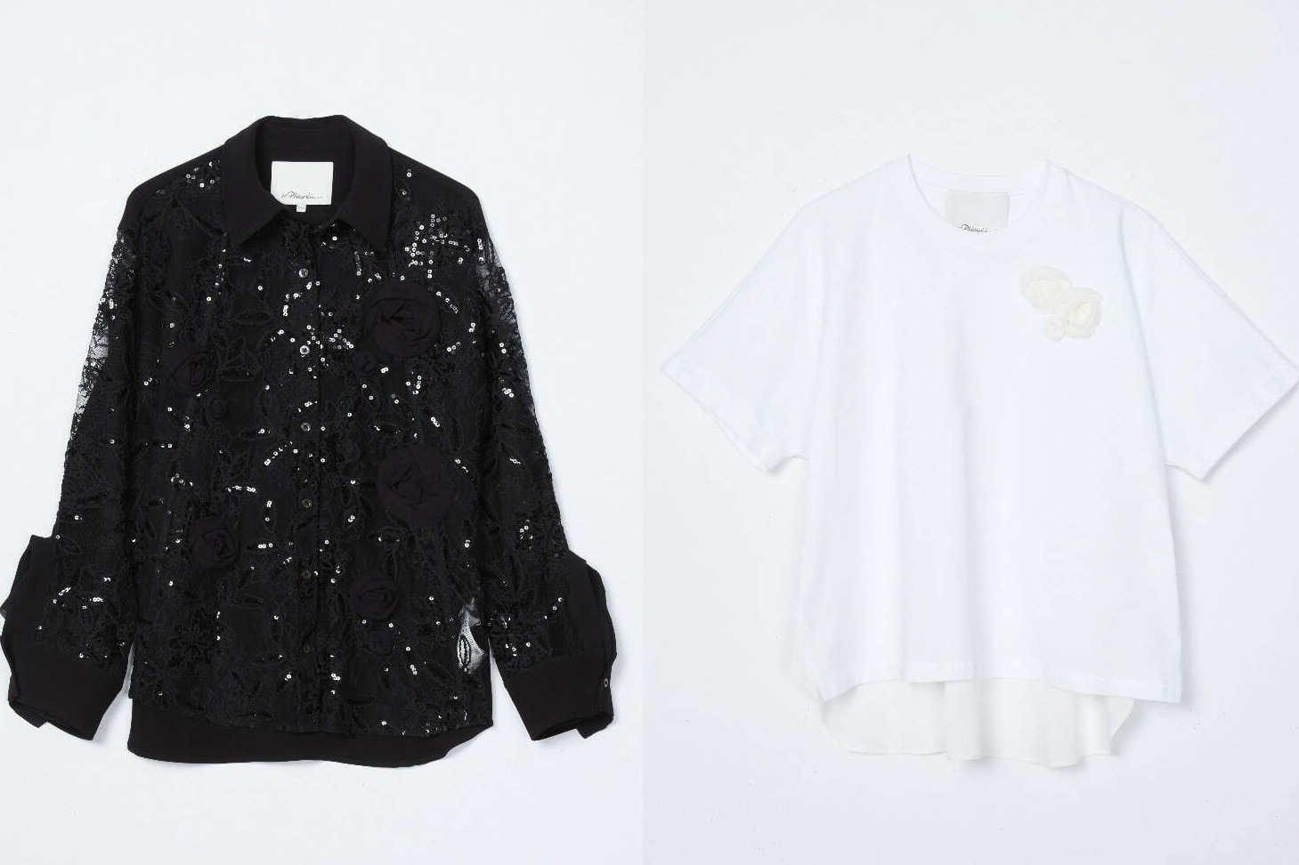 「ロゼッタ付きTシャツ」は、前後で異なる表情を楽しめるのがポイント。フロントはジャージー素材、バックはなめらかなドレープ感を生む同色のマットクレープ素材を使用した。フロントの胸元には、ロゼッタをワンポイントで配している。