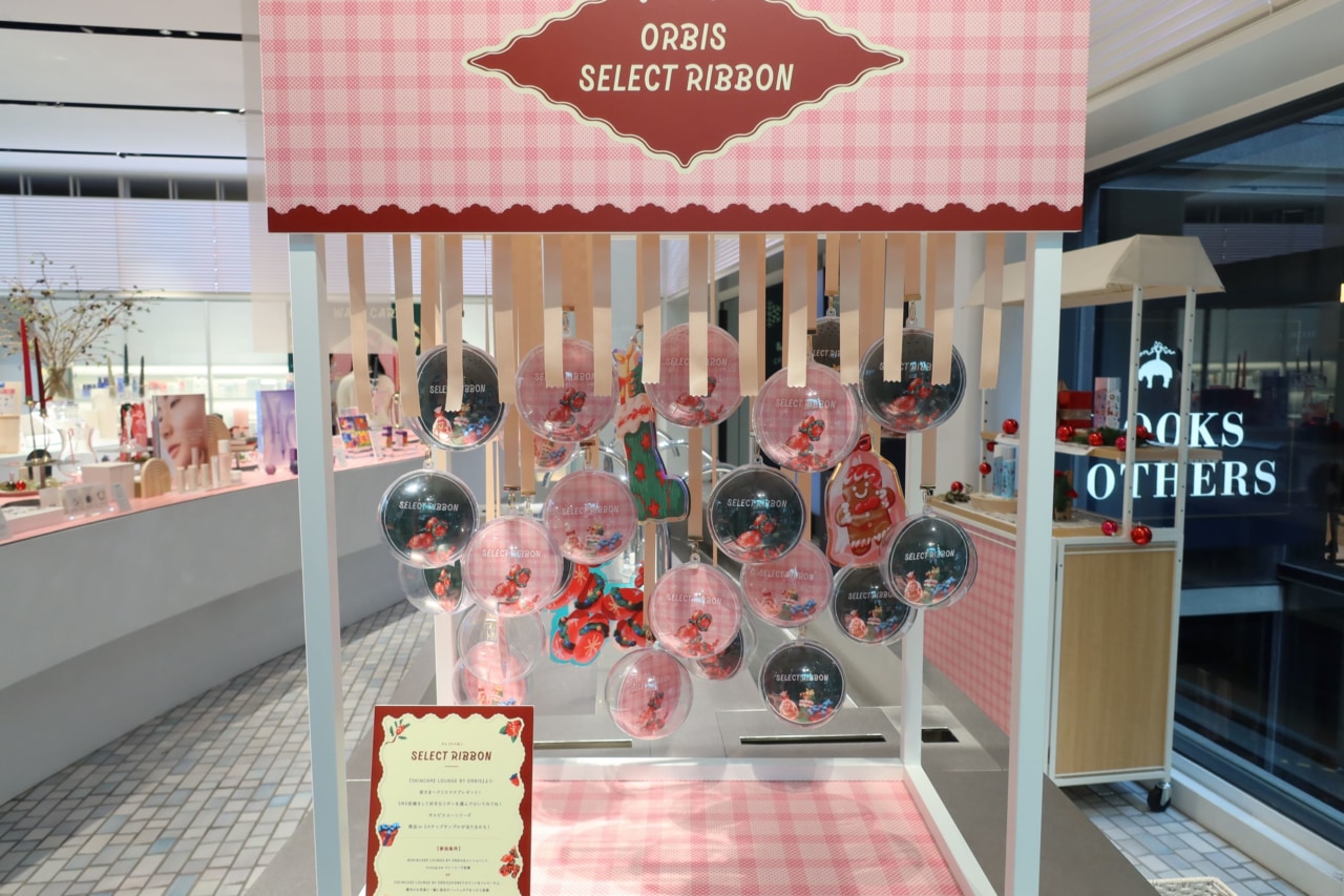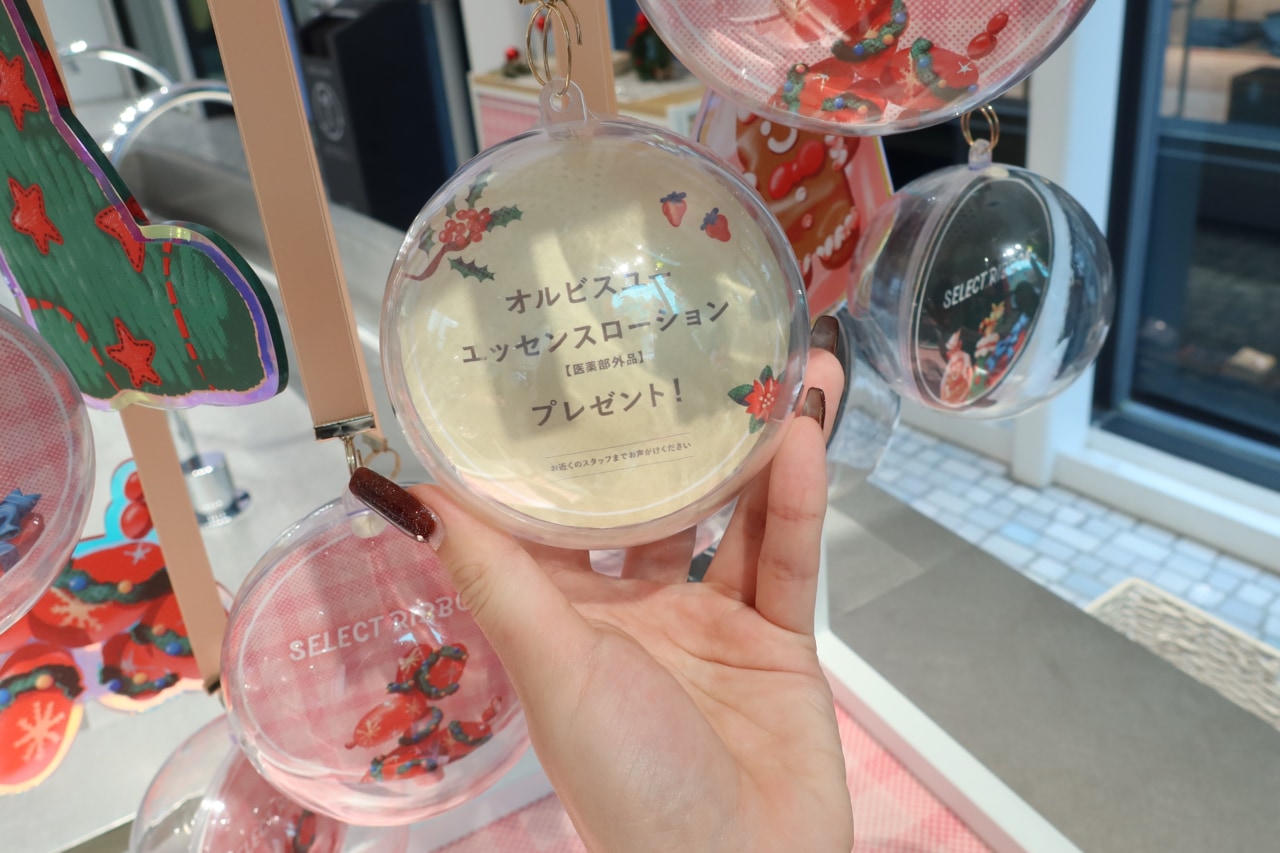 『SKINCARE LOUNGE BY ORBIS』の店内全体がホリデーシーズンならではのハッピーな空気感に包まれています。施設内の1階では、オルビスからのクリスマスプレゼントが当たるスペシャルコンテンツ『SELECT RIBBON』も。