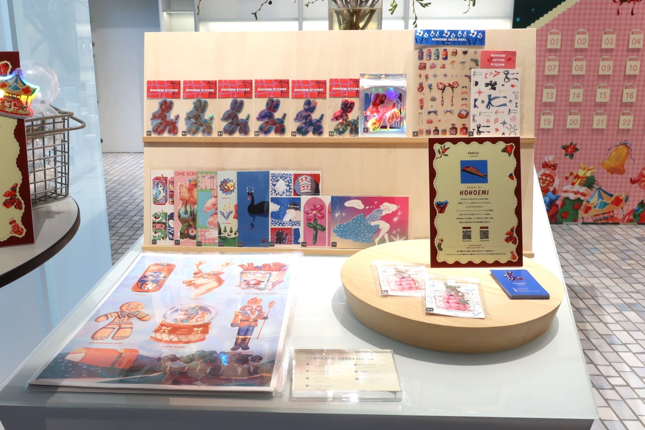 店内ではHOHOEMIさんのグッズを購入することもできます。ポスターやステッカー、タトゥーシールなど、どれもすてき! ぜひこの機会にHOHOEMIさんのイラストもチェックしてみてください。