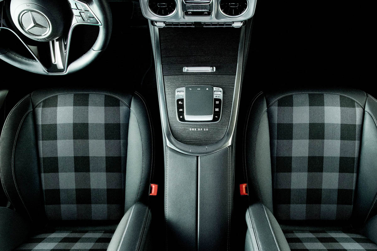 左ハンドル仕様となるインテリアは、ファブリックにレザーを組み合わせたシートを装備。そのファブリック部分のチェックパターンは、Gクラスの初期モデルのデザインを再解釈し現代風に仕上げている。助手席側のグラブハンドルには「PAST Ⅱ FUTURE」の文字が添えられ、センターコンソールには世界限定20台であることを示す「ONE OF 20」の文字が刻まれている。