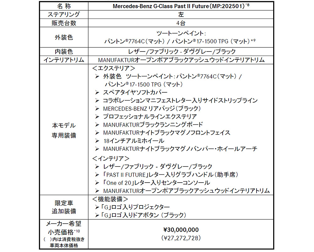 メルセデス・ベンツ日本は2025年4月4日、グローバルで限定20台、日本市場で4台のみのGクラスの特別仕様限定車「Gクラス パストⅡ フューチャ(「PAST Ⅱ FUTURE))」の予約受注を開始した。