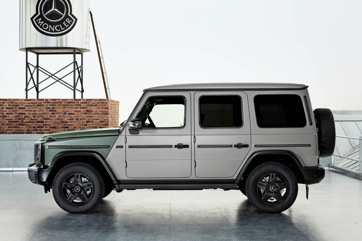 メルセデス・ベンツはGクラスをべーにして2023年、2024年にもモンクレールとコラボしているが、今回はフロントまわりとキャビンとで区切られたオリーブグリーンとグレーの2トーンペイント(マットカラー)を採用し、フロントフェイスは特別色「MANUFAKTURナイトブラックマグノ」で塗られ、ヘッドランプ周辺まで全面的にブラックカラーを施すことで、初代Gクラスをイメージさせるモデルとなっている。
