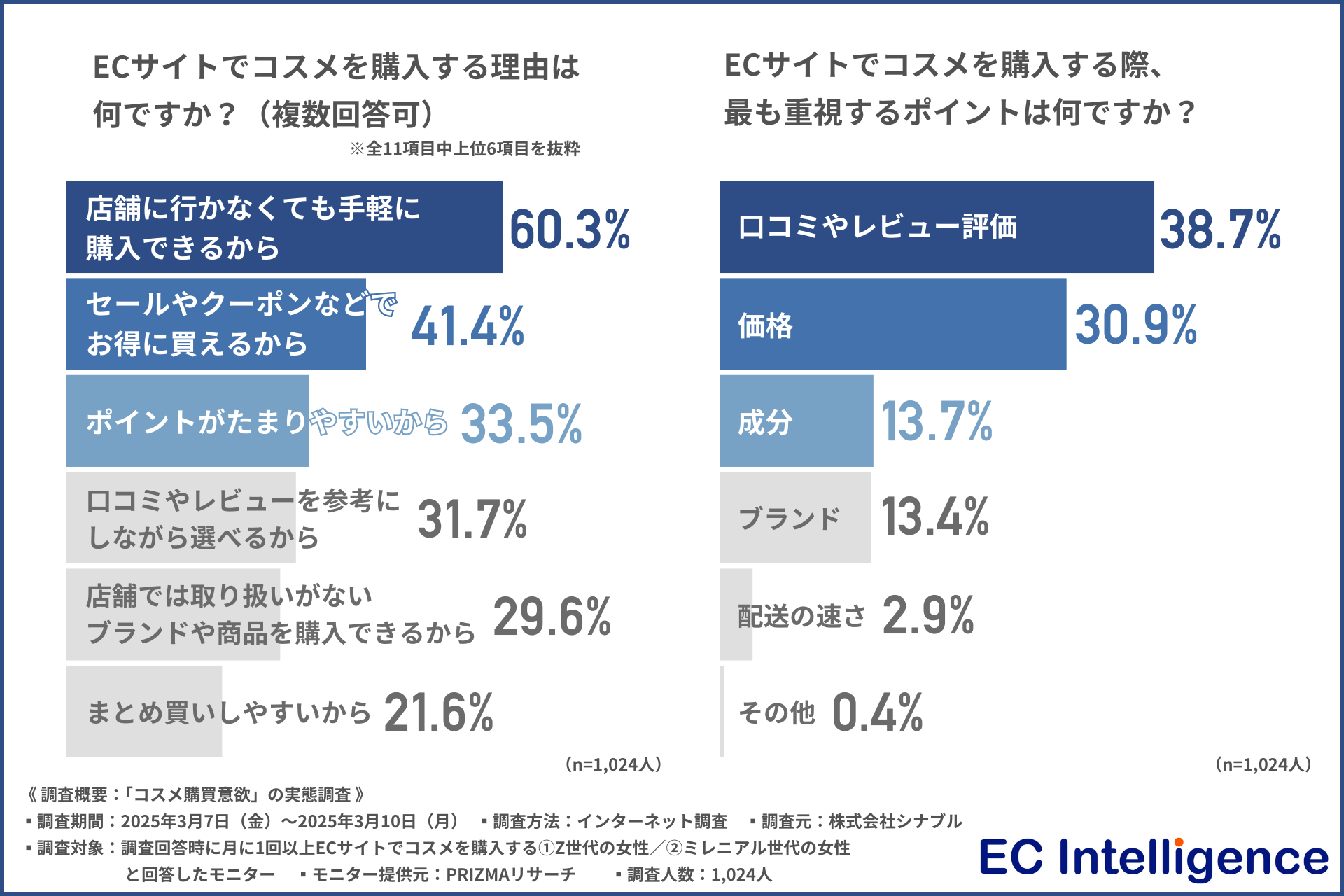 ▲ECサイトでコスメを購入する理由・ECサイトでコスメを購入する際最も重要視するポイント