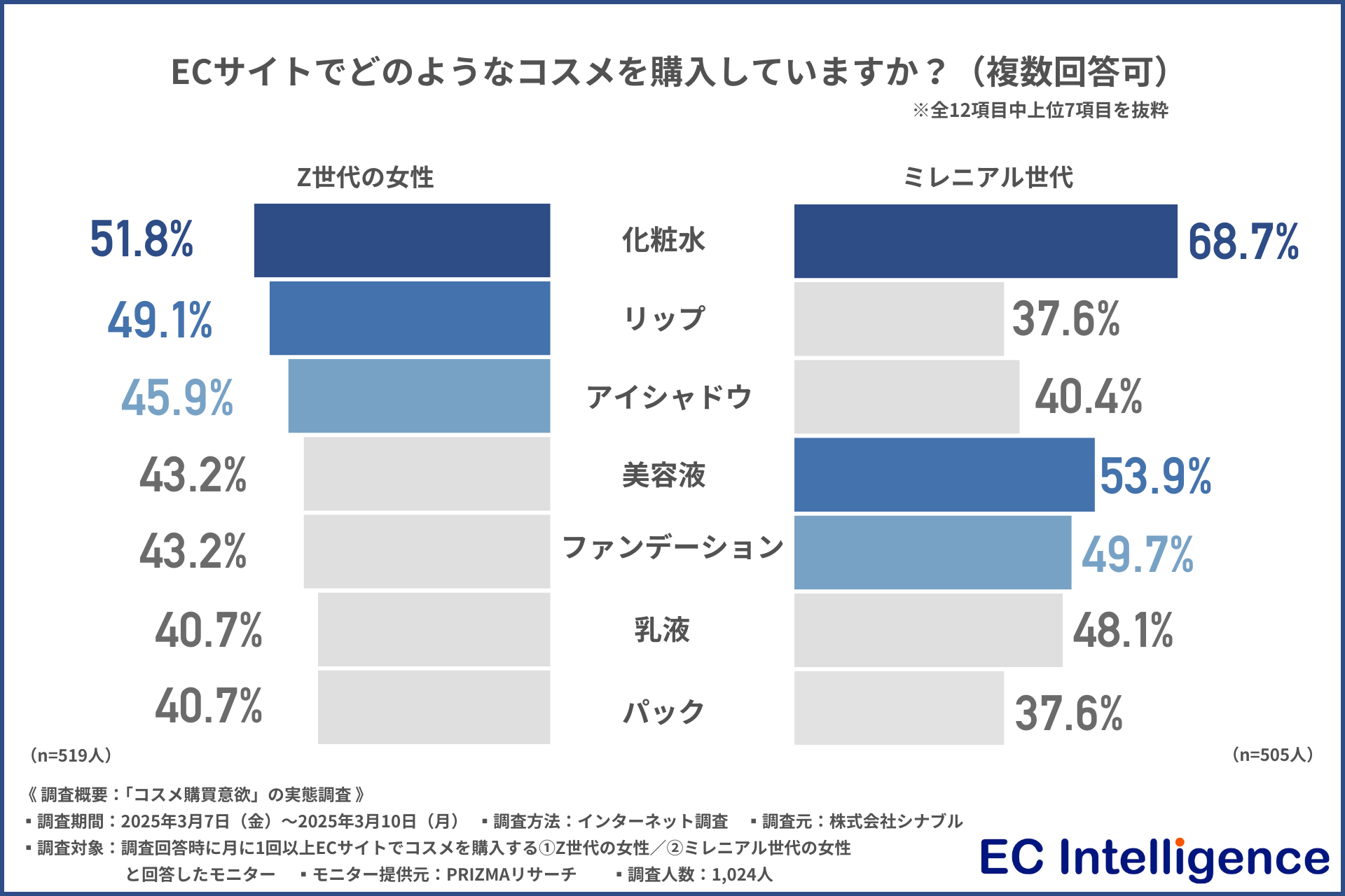 ECサイトでどのようなコスメを購入しているかをたずねた問い(複数回答)では、Z世代女性の上位は「化粧水」(51.8%)、「リップ」(49.1%)、「アイシャドウ」(45.9%)、ミレニアル世代女性の上位は「化粧水」(68.7%)、「美容液」(53.9%)、「ファンデーション」(49.7%)だった。どちらの世代も「化粧水」を購入している人が多い一方で、2番目以降には違いがあり、購入アイテムの傾向にも世代間での差があることが示された。