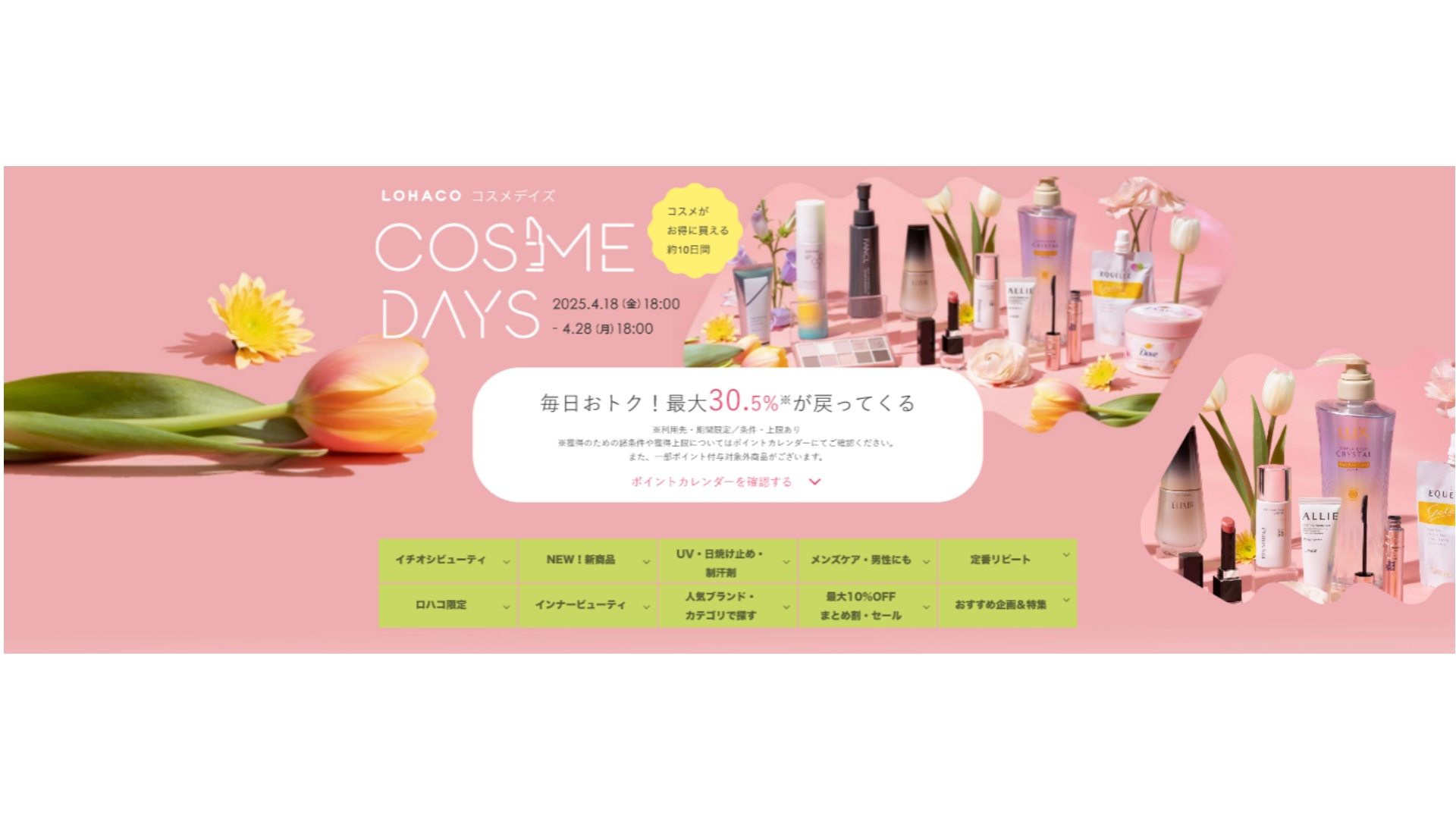 今回の「LOHACO COSME DAYS」には、単品で買うよりも得するLOHACO限定セットをはじめ、イチオシの春の新商品、メイク、ギフトなどが登場。これに加え、人気ブランドや、LOHACOスタッフが厳選した春の新作コスメ&ヘアケア商品を紹介する。