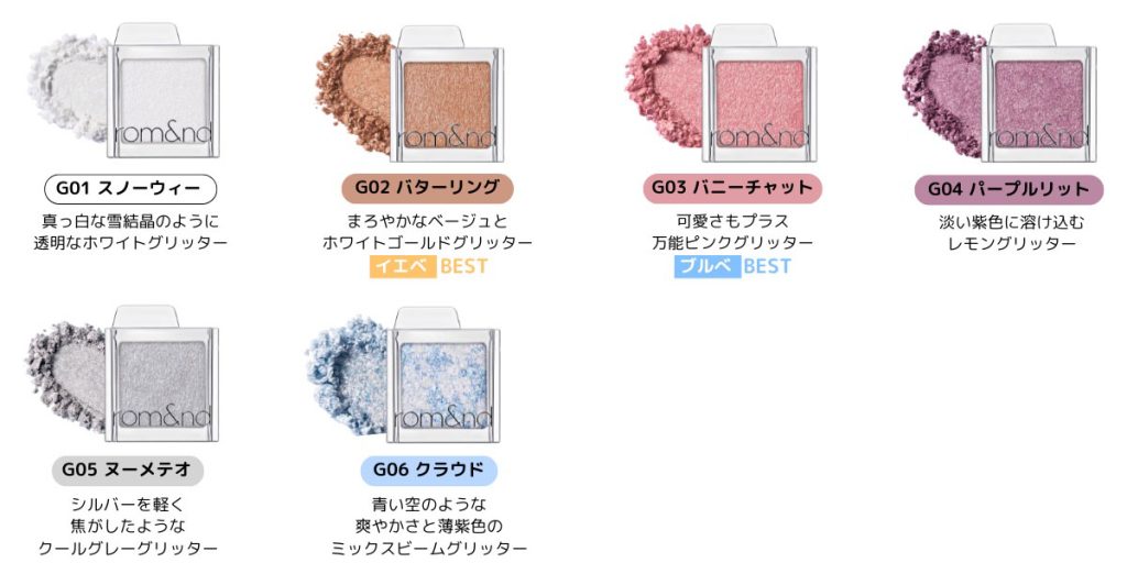 各テクスチャーは粉飛びしにくく指での塗布も可能な高密着タイプに仕上げた。マットタイプは涙袋やハイライトなどの陰影づけに、シマータイプはさりげない輝きや透明感を出したい場合に、グリッターは目元に華やかさをプラスしたい場合に最適だ。ブランドはリップカラーで培った色彩センスを活かし、イエベ、ブルベなどのパーソナルカラー別に似合う色を提案。どのカラーもアイシャドウだけでなく、ハイライトやチークとしてもマルチに使えるアイテムとなっている。