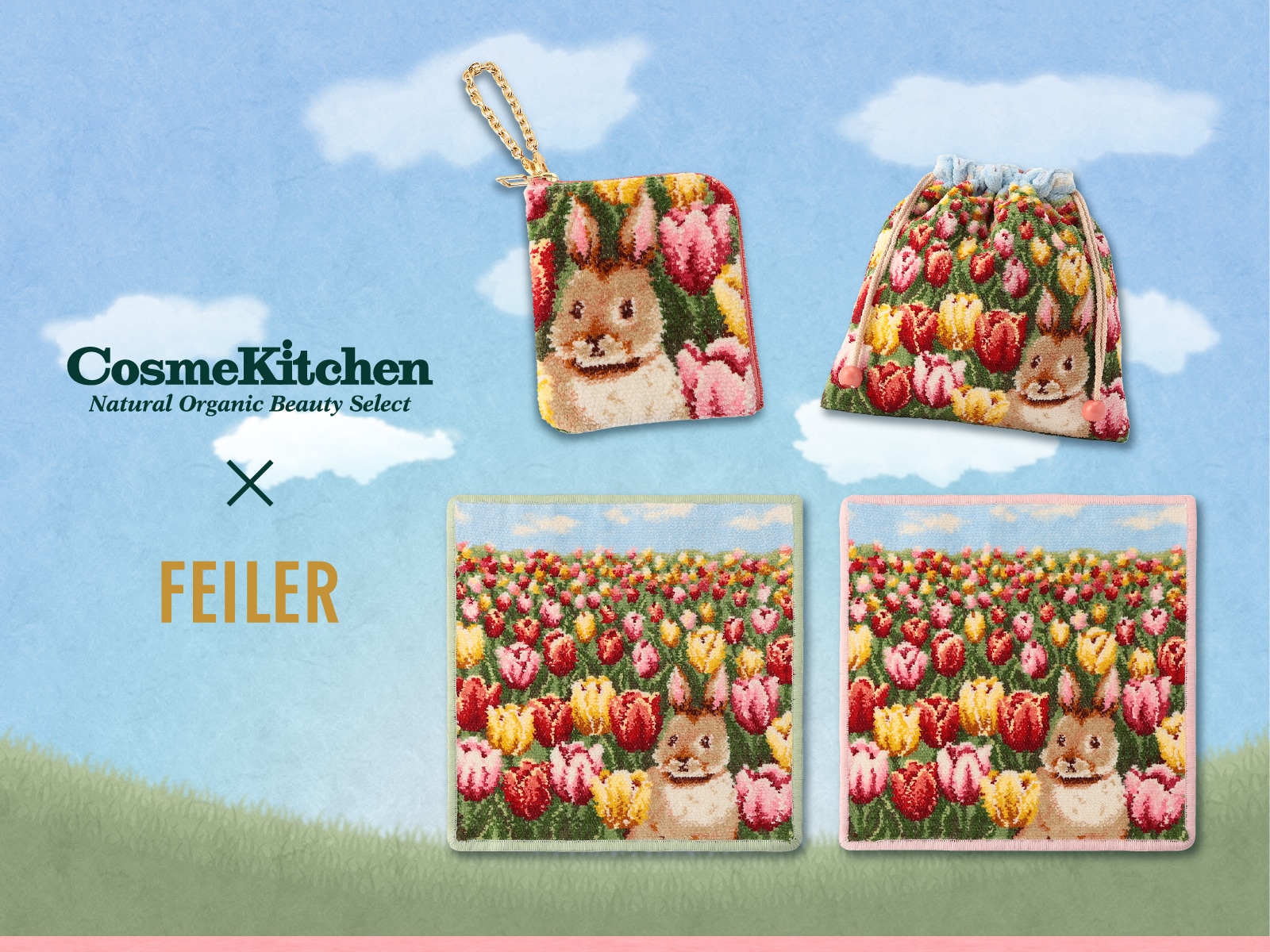 世界中の個性豊かなナチュラル&オーガニックコスメやナチュラルアイテムをラインナップするCosme Kitchen (コスメキッチン)との人気コラボレーション第5弾。どこまでも続くチューリップ畑からひょっこりと顔をのぞかせた愛らしいウサギを織りあげました。爽やかな青空と春風に揺れる満開のチューリップに幸せを感じるデザインです。商品はハンカチ、ポーチ、巾着をラインアップ。ギフトにもおすすめです。