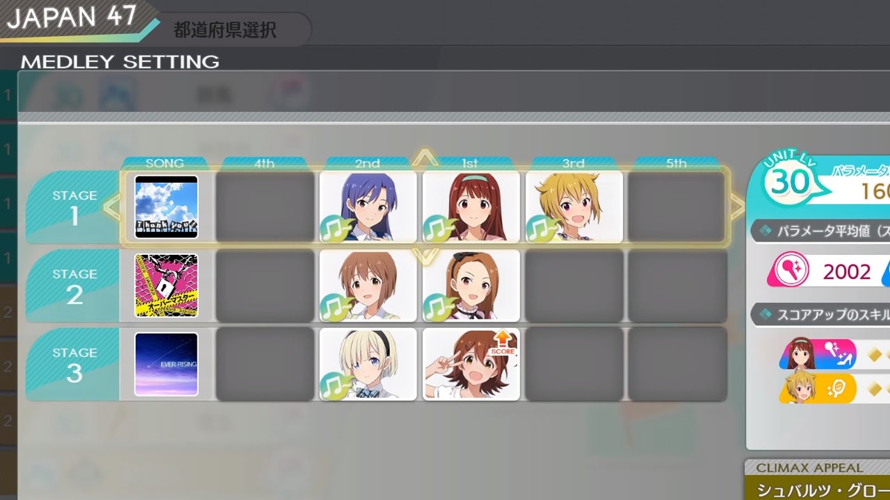 最初は千早を3曲に入れて、千早で最後のユニゾン発動を行っていたのですが、千早のステータスが高すぎて