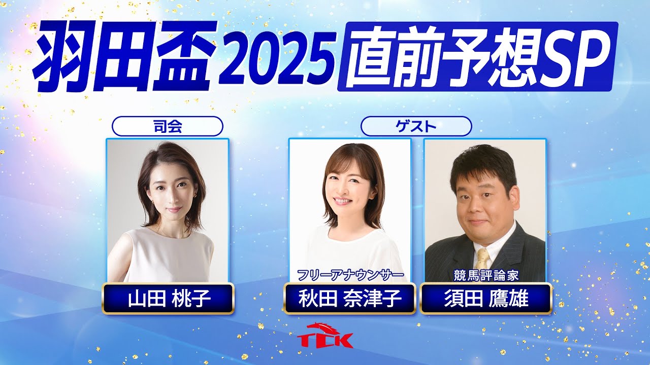 番組では、司会に南関キャスターの山田桃子さん、ゲストにフリーアナウンサーの秋田奈津子さん、競馬評論家の須田鷹雄さんをお迎えし、羽田盃を徹底的に分析し予想します。