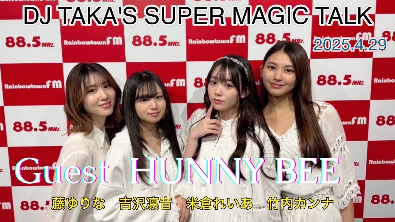 ゲスト アクターズアイドル HUNNY BEE から 武内カンナ、吉沢凛音、米倉れいあ、藤ゆりなさんの4名のメンバーとのスペシャルトーク 2025.4.29 Hell Tusedaz !! 特別番組 DJ TAKA’S SUPER MAGIC TALK 17:00〜18:00 スペシャルゲスト アクターズアイドル HUNNY BEE レインボータウンFM 木場REGALEスタジオから公開生放送の模様をお届け 途中楽曲放送中は無音声になります。 idolアイドル米倉れいあ Write A Commentコメントを投稿するにはログインしてください。