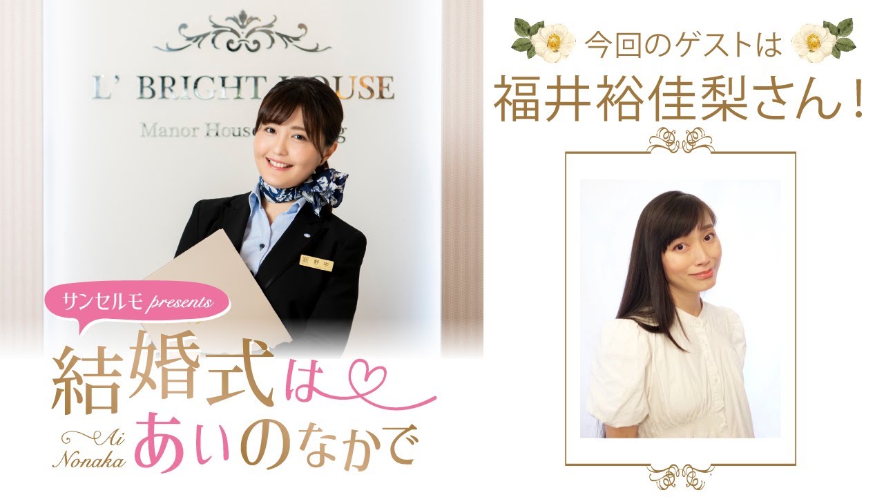 [音楽] サンセルモプレゼンツ結婚式は愛の中 で皆さんこんばんは。野ナ中です。この 番組は私の野ナがウェイディング プランナーとなってエルブライトハウス からお届けするA&Gブライダル ステーション。結婚式は愛の中でです。私 が今いるエルブライトハウスは文化放送 から徒歩1分の場所にあります結婚式場 です。この式場でゲストの方には ウェディングドレスやタキシドなどを着て 登場していただくのがお決まりとなって おります。今回はゲストに福井ゆかりさん をお迎えします。この後登場されますので お楽しみに。それでは始めていきましょう 。サンセルモプレゼンツ結婚式は愛の中で 本日もの中がご案内いたします。 この番組は感動と感謝の思いをつなぐ3 セルモの提供でお送りします。 [音楽] 浜松町駅たった1 分で貸切りでアットホームな結婚式場があるの。絶対みんなにも喜んでもらえると思うんだ。エルブライトハウス行ってみよう。 [音楽] サンセルモプレゼンツ結婚式は愛の中で。改めまして野中です。それではご紹介しましょう。本日のゲストはこの方です。 [音楽] 皆さんこんばんは。 え、本日は喋る新父井ゆかりです。よろしくお願いいたします。 お願いします。喋る新父喋らせていただきます。 [拍手] 確かになんか実際のね、結婚式だとね、喋る機会ってあんまりね、新婦さんないですもんね。 [音楽] そうですね。喋らないっていうイメージがあったんですけど、 こうが拝見させていただいたら皆さんすごいいい声で終いうのはい。 はい、私も今日はしっかり貼って喋っていきたいなと思います。よろしく。 貼ってる。貼ってるんですね。私は あんまり意識してなかったんですが。 ああ、今日すごいおきれです。 いや、 今日っていうかつもおきれですけど。 おきれ。いやあ、もう私もびっくりしました ね。 ふわふわのこのレースがこう見る角度によって光の加減で [音楽] あ、2種類のなんかレースがこう 違うんですね。はい。輝きが違うらしくて はい。ちょっとそれもしっかり見たいなと ね。あとこうはい。 こう上に続くレースの刺がまた豪華な感じと繊細さと [音楽] また違うみたいで、 あの左右があのこうまたデザインが素敵で綺麗な天才ですよね ね。本当にどの角度から見てもいいですよね。違った表情が見られるデザインというか、ドレスというか。 に美しい ねえ。ベールもとっても似合いです。 いやあ、ありがとうございます。 ど、どうですか?着心地はいかがですか? 着心地もうん。 すごく私、あの、こう風がこう通り抜けるのが好きなんですけど、その通り抜ける感じがあってうん。 うん。 あの、なん、なん、表現するのが難しいんですけど うん。 なんかす々しくって幸せです。はい。私、あいちゃんのあのウェディング姿も見たいなってすごい思います。 ええ、本当ですか?前是あの YouTube の方のアーカイブでオープニングで私の姿から始まるので、 あの見れたと思って はあぜ非ぜひになってみてください。 私だけこんな美しい姿でありがとうございます。 え、こちらこそです。 こしなくても綺麗ですけど 全然全然それではどうぞこちらにおかけください。 お願いいたします。はい、 今日はよろしくお願いします。 お願いいたします。うん。 なんかあれですね。こうツっコみ不在みたいな感じで、 え、 今日はちょっと進んでいきそうな雰囲気を皆さんオープニングで感じたかもしれませんが。 いや、あの、私はそういうんじゃないので、あの、あちゃんはそうかもしれないんですけど、 あの、 私もそう言うんじゃありません。 私がじゃあちょっと突っ込めるようになんかこうあいちゃんみたいなふわっとしてって幸せだと幸せでこうふわっと私もしちゃったりするんですけどでも今日あのしっかりこうふわっとしないように [笑い] はい あいちゃんに突っ込め突っ込んでいけるように行きます はいわかりました ねあちゃんもしっかり落ち始めましたけど私もしっかりして あ本当ですかやっていきたいと あしっかりを組んでいきましですね。 はい。 どっちかがしっかりしてればいいやねんてことですか?だめ。 [笑い] 分かりません。私にもちゃんと正解が分かりません。難しい。 難しいですね。 難しいですね。あれですよね。ゆかりさんとはあれなんでしょうね。なんか大きなイベントとかで なんか別作品で一緒してたりとか。 うん。そう。 直接のなんか作品がっつりとかって今までなかったですもんね。 そうなんです。作品っていうのはないんですけど、 なんかそのすごい遠くからふわっと現れて なんか不思議なことを一言って どこかに行かれたんですよ。 とか別に不思議の話してどっか行かれたからあれ知り合いだったかなとあれ待って一方的に多分知ってるつもりカさんの名前を多分雑誌とか見たりとかして知ってるつもりでいたんでしょうね。 [笑い] あ、そうだったんですかね。 なんかあれち、あの中さんお酒飲まれてるのかなと思って。いや