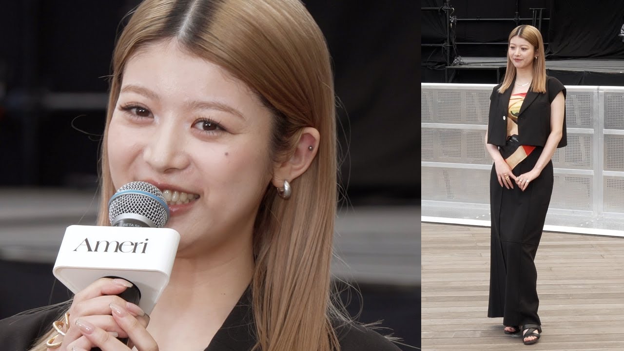 よろしくお願いいたします。こちらていただきますか?さ、まずはですね、こセッションからスタートしていきたいと思います。センターのスチールからお願いいたします。こちらからお願いします。お願いします。今日お願いします。こちらお願いします。 [音楽] [音楽] はい、2列目です。お願いいたします。 ありがとうございます。 それでは僕行きましょう。こちら側ですね 。次の奥側です 。佐ムービーこちらから見て左側いただい ています 。あといいよ 。はい、ありがとうございます。 コーディネートのポイントを教えて ください。はい。 え、本日は、えっと、ブラックのセットアップなんですが、本当はトップスはキャミソウル型のベストもついているんですが、今日はあえて短いものだけを、え、着用して、中には今回のグッズであるスカーフをインナーとして 着用しています。 今回のグッズをインナーで巻いてる。 はい。巻いています。 お、後ろで巻いてトップスとして活用しているということです。 え、アメリが10 周年ということでして、10 年以上続けていることや10 年後も続けていきたいことは ございますか?そうですね。でもやはり 10年となると、ま、お仕事かなと思うん ですけど、ま、それ以外にプライベートで 10年続いてることが今のところないので 、お仕事は10年間、10年以上続けてき ましたし、これからも10年以上続けて いきたいなと思ます。はい。お仕事を10 年続けてきて、これからもね、はい。 引き続き頑張ってきたというこでござい ました。 で、今回のですね、フェスのテーマがウェルビイングということで、アメリでは様々な年齢や立場の中で誰しもが働きやすく自分なりのルールで幸せを実現することがコンセプトとなっておりますが、え、幸せに過ごすためのマイルございますか? そうですね、やはり美味しくご飯を食べることかなと思いますと、ま、毎日々生きてる中で、ま、楽しいこ だけじゃない日ももちろんありますけど、そんな日も美味しくご飯を食べて次の日の活力にしています。 3色しっかりとはい、食べる派ですね。 食べたいと思っています。 はい、 ありがとうございます。最後になりますが、 10 周年を迎えたアメリにお祝いコメントをお願いいたします。 はい。え、10 周年本当におめでとうございます。 えっと、これまでも本当にたくさんの 可愛らしい日常がすごく楽しくなるお洋服 をたくさん作られてきたアメリさんなので 、これから先も、え、楽しい素敵なお洋服 を作り続けていってくださることを楽しみ にしています。はい。はい。ということで バ文香さんでした。ありがとうございまし た。ありがとうございました 。こちらどうぞ。